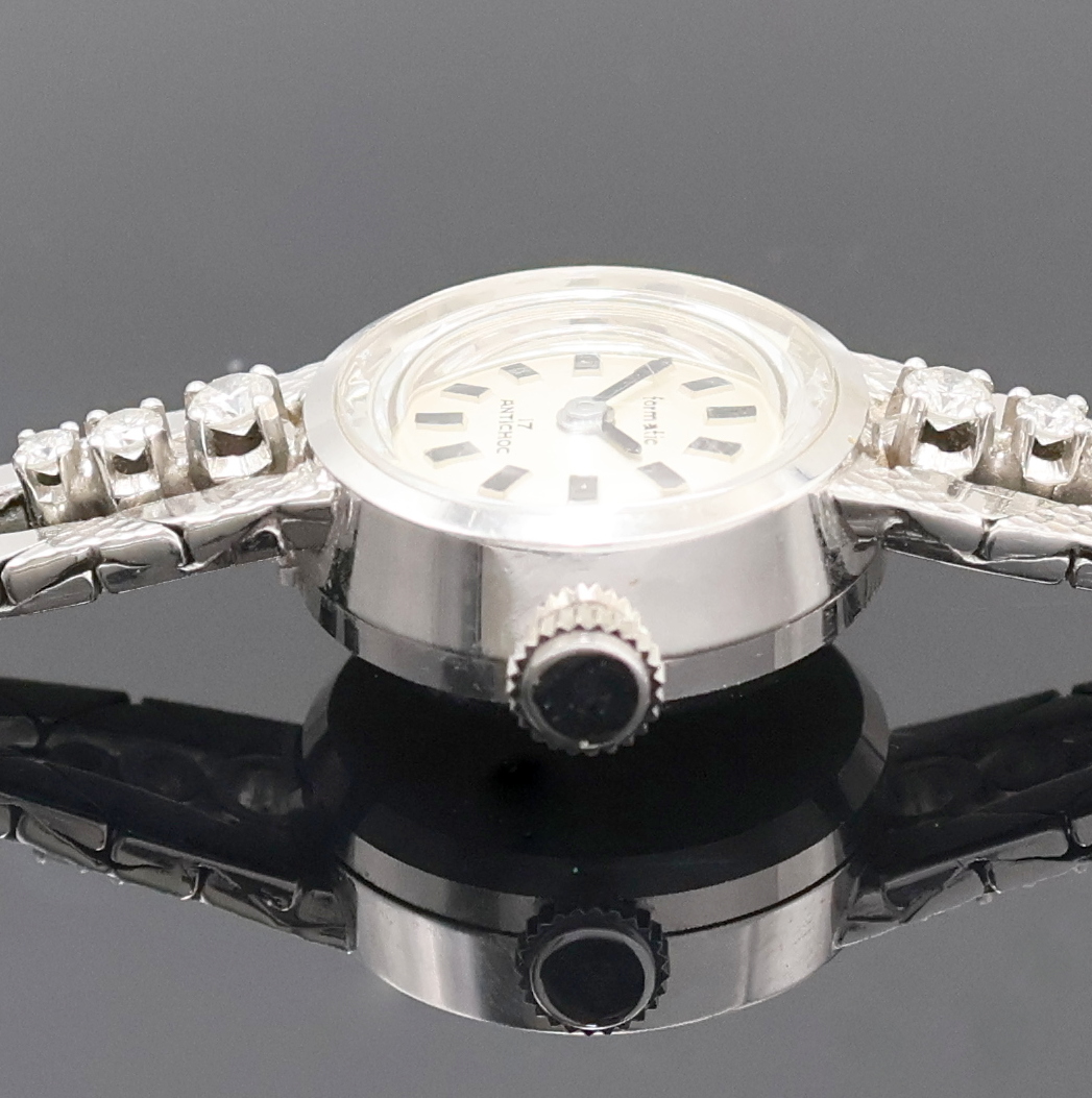 inkl. Goldband m. 6 Diamanten u. Klappschl., Boden aufgedr., silb. Zifferbl. m. aufges.
