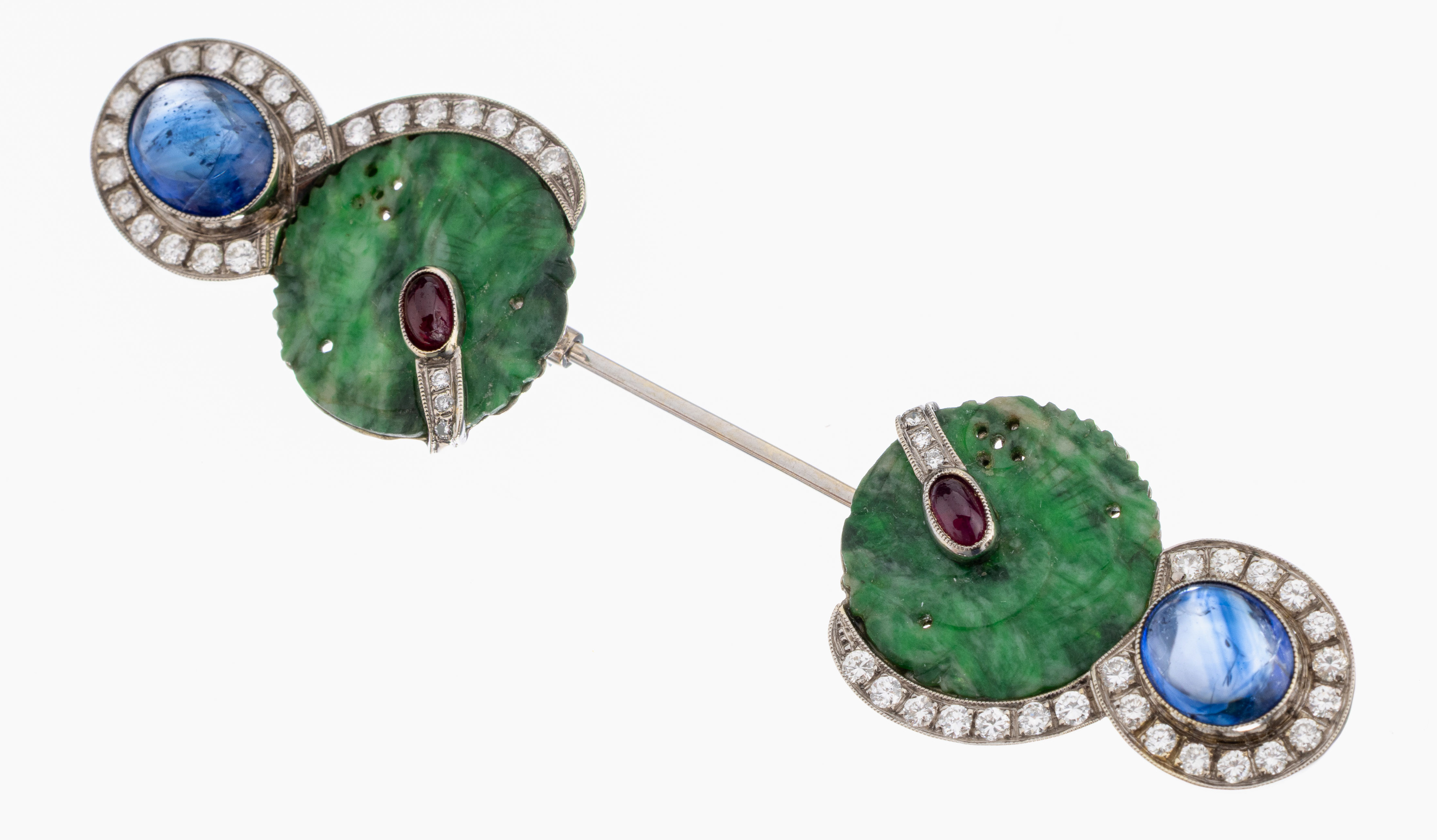 Ausgefallene 18 kt Gold Art Deco Jade-Rubin- Saphir-Brillant-Anstecknadel, um 1925,