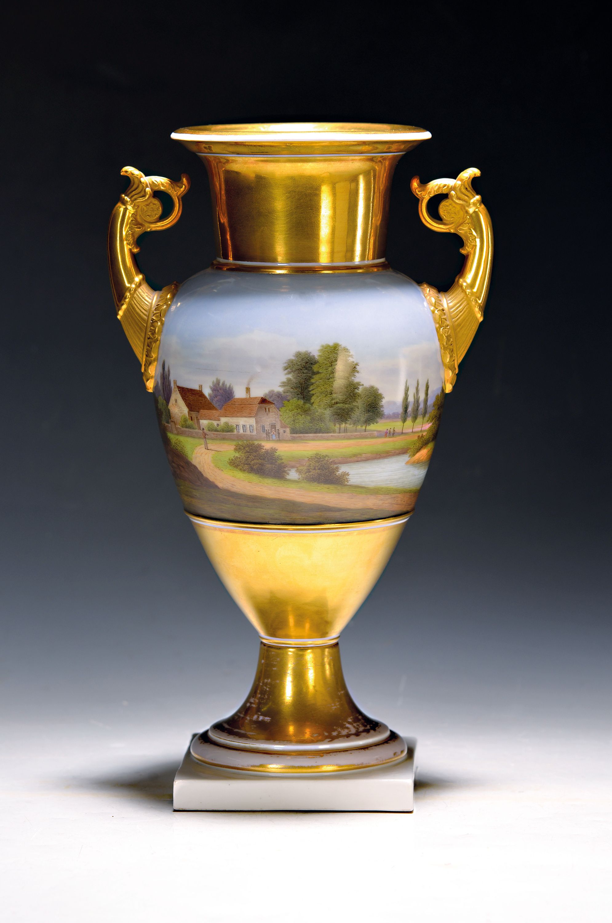 Amphorenvase, KPM Berlin, nach 1870, Porzellan, Goldfond, umlaufende Landschaftsdarstellung,