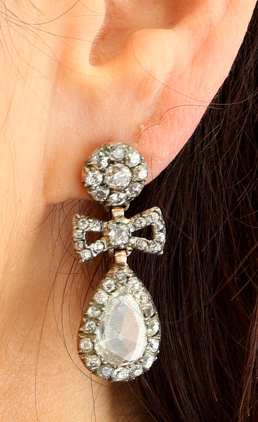 Paar 14 kt Gold Diamant-Ohrgehänge, um 1790- 1810, RG 585/000 und Silber, 2 Diamanttropfen