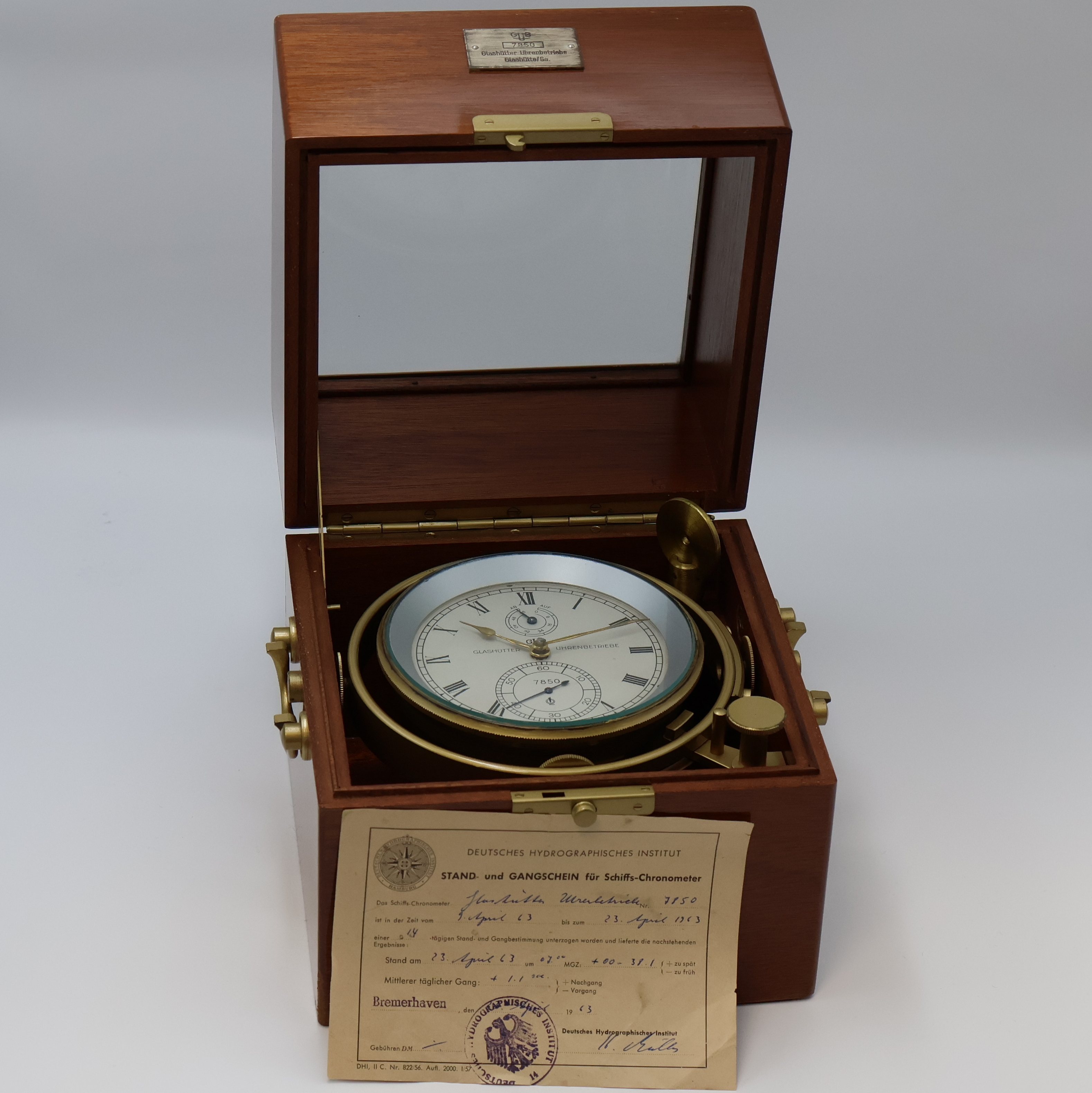 GUB Marinechronometer mit original Transportbox und Gangschein, DDR um 1963, 2 -tlg.