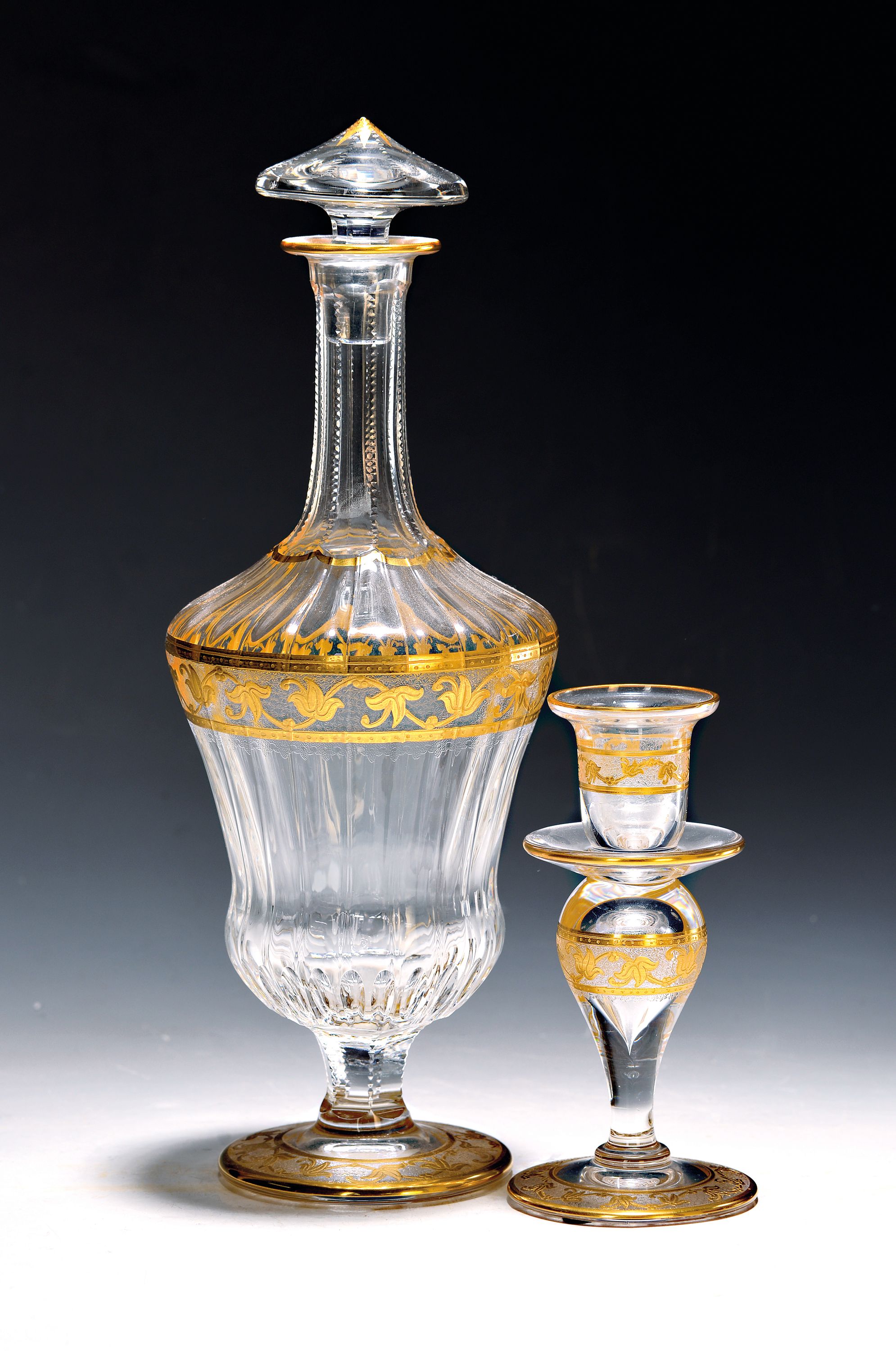 graviert und teilvergoldet, Stöpsel innen l. best., Karaffe H. ca. 31 cm, Leuchter