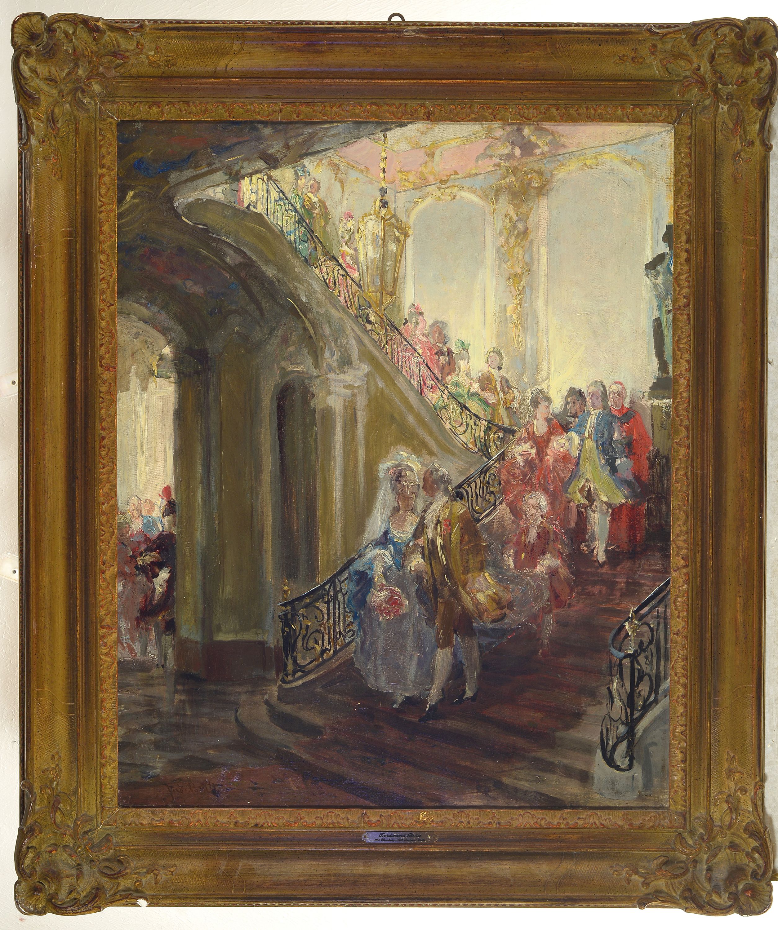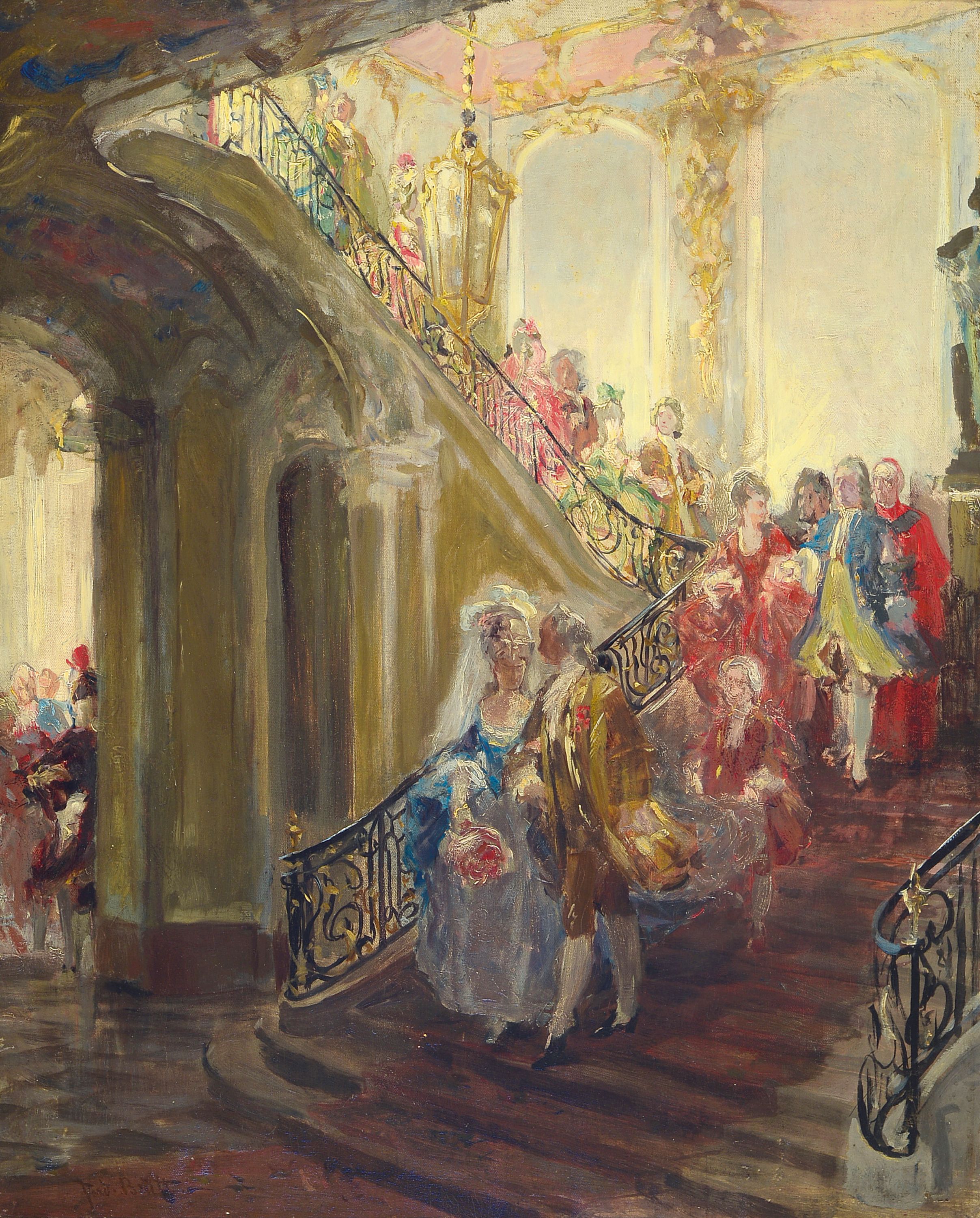 1881.1), um 1881, Rokokogesellschaft beim Herabschreiten einer repräsentativen Treppe,