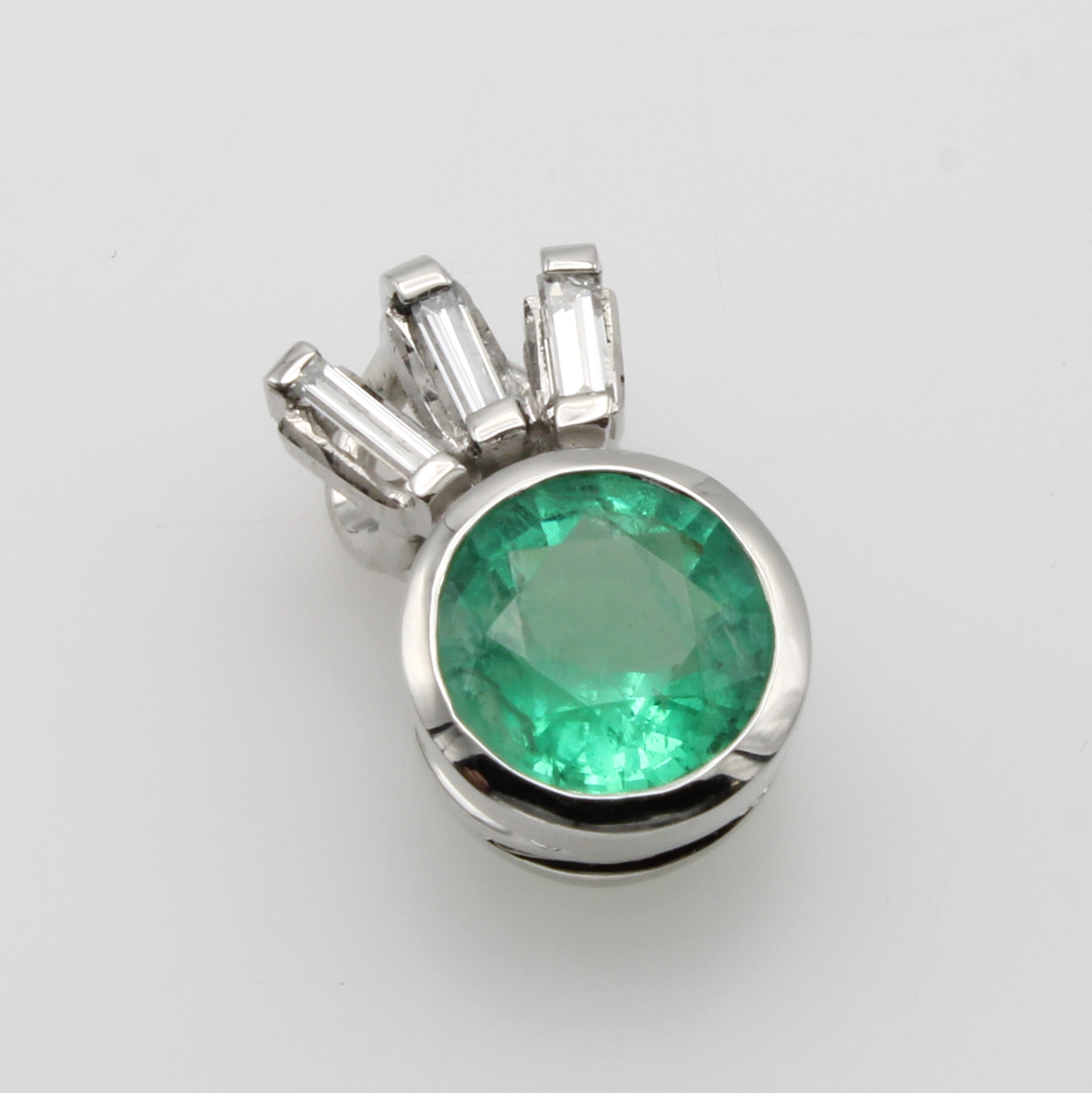 Anhänger mit Smaragd und Diamanten, WG 750/ 000, rundfacett. Smaragd ca. 2.11 ct und 3 Diam.-Navettes zus. ca. 0.20 ct feines Weiß/si Schätzpreis: 4850, - EUR