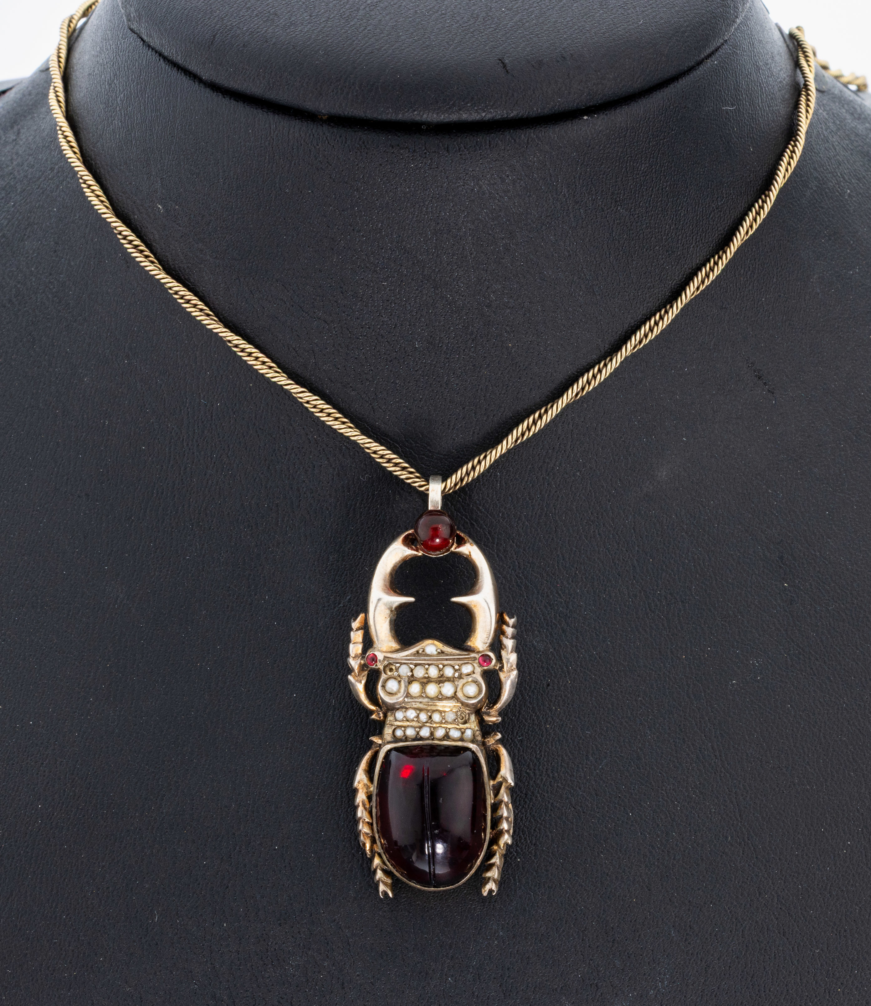 Hirschkäfers, part. granatfarb. Glassteine, kleine Saatperlen, 1 Perle fehlt, L.