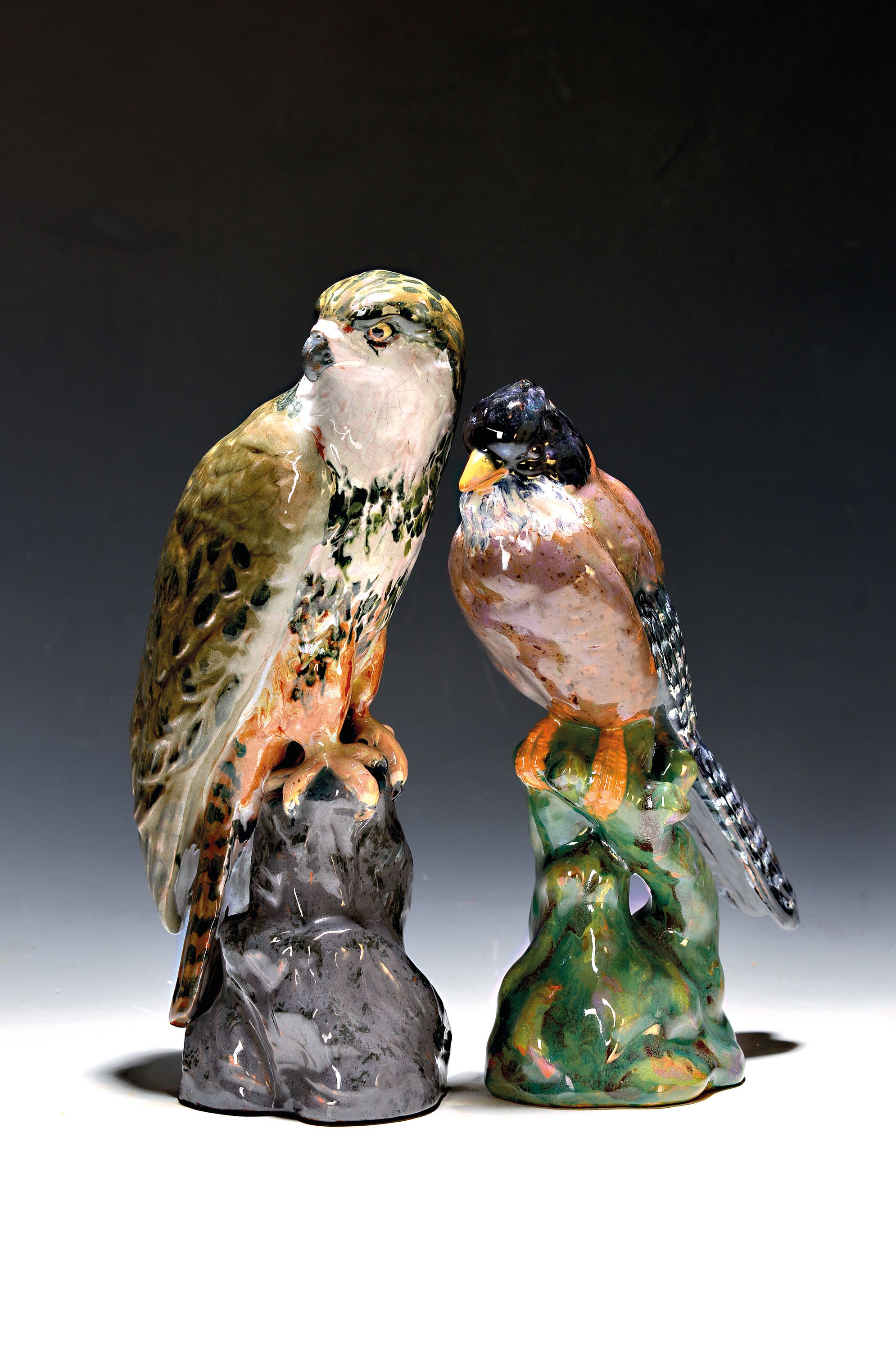 2 Vogelfiguren, Karlsruher Majolika, Emil Pottner (1872-1942), 1911-23, farbig staffiert,