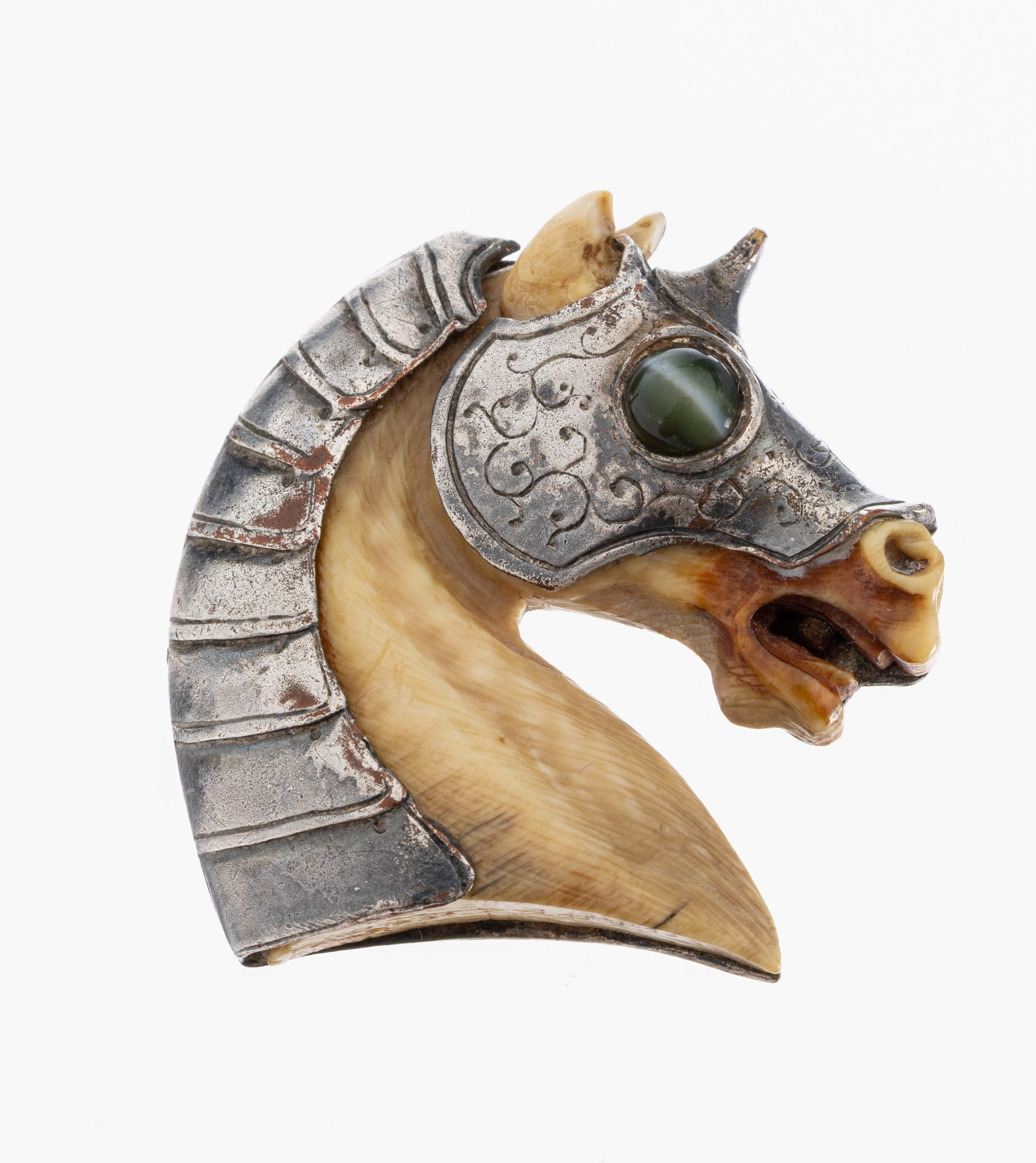 Pferdekopfes, aus Bein geschnitzt, Rüstung ausSilber part. floral grav., Auge synth.