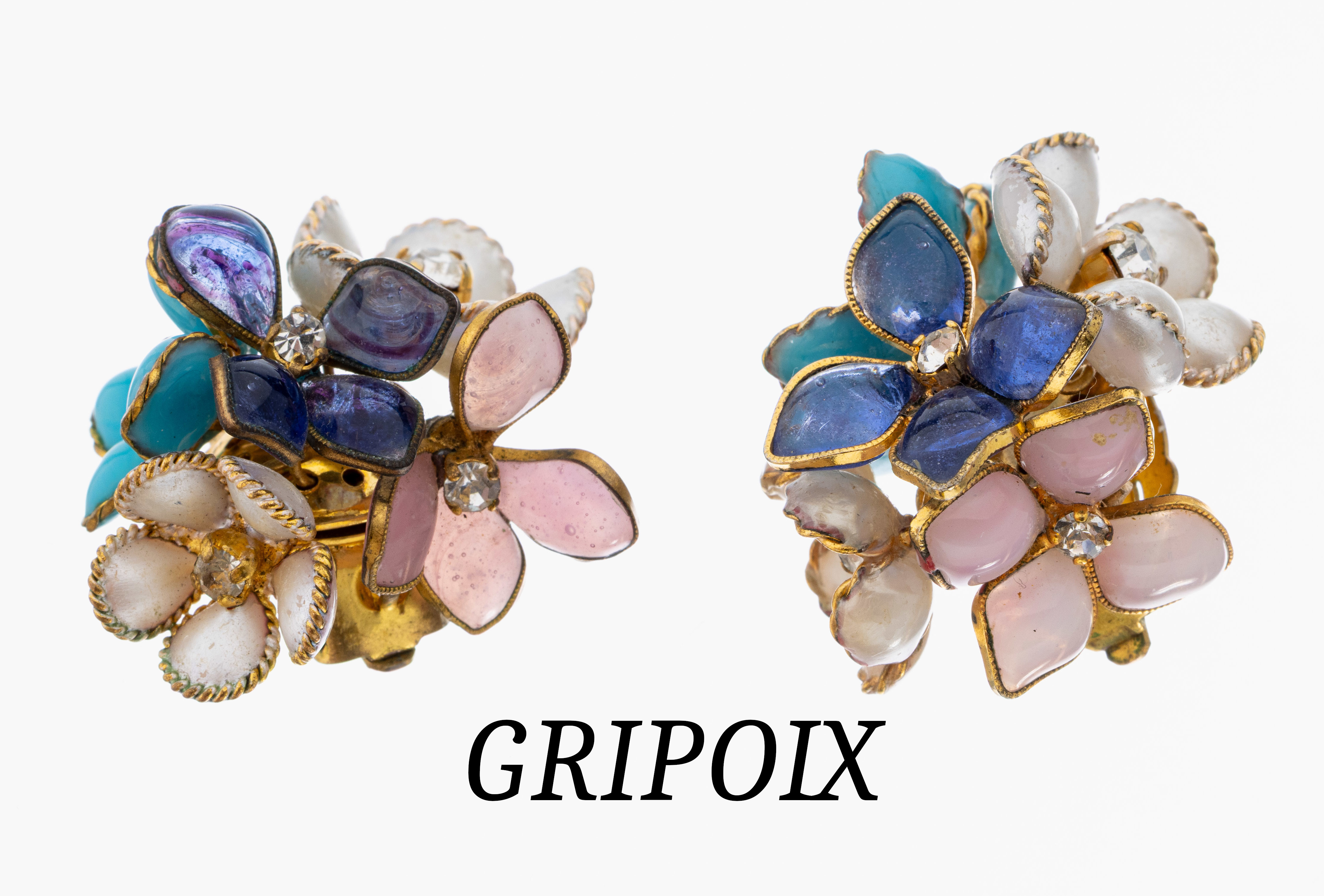 Paar Ohrclips GRIPOIX für CHANEL, 1930er Jahre, Metall, plastische Blüten, Blätter