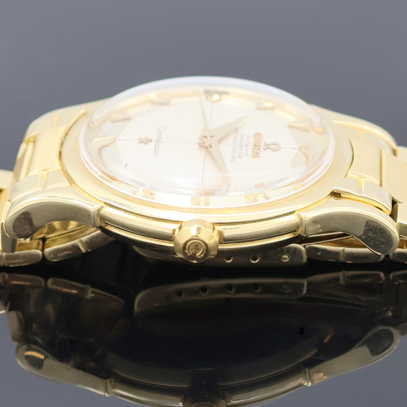 OMEGA Constellation Armbanduhr in GG 750/000 Referenz 2852SC, Schweiz um 1960, Automatik, Boden m. Darst. Sternwarte aufgedr., seltenes orig. Goldband vom ersten Quartal 1961, teils flexibel m. orig. Faltschl,. silb. Pie-Pan Zifferbl. m. gold. Std.-Ind., gold. Zeiger, Rotgold. Werk, Kal. 505, 24 St, 5 Adj., Feinreg., D. ca. 35 mm, L. ca. 17 cm, Gew. ca. 96g, Omega Box anbei, EZ 2