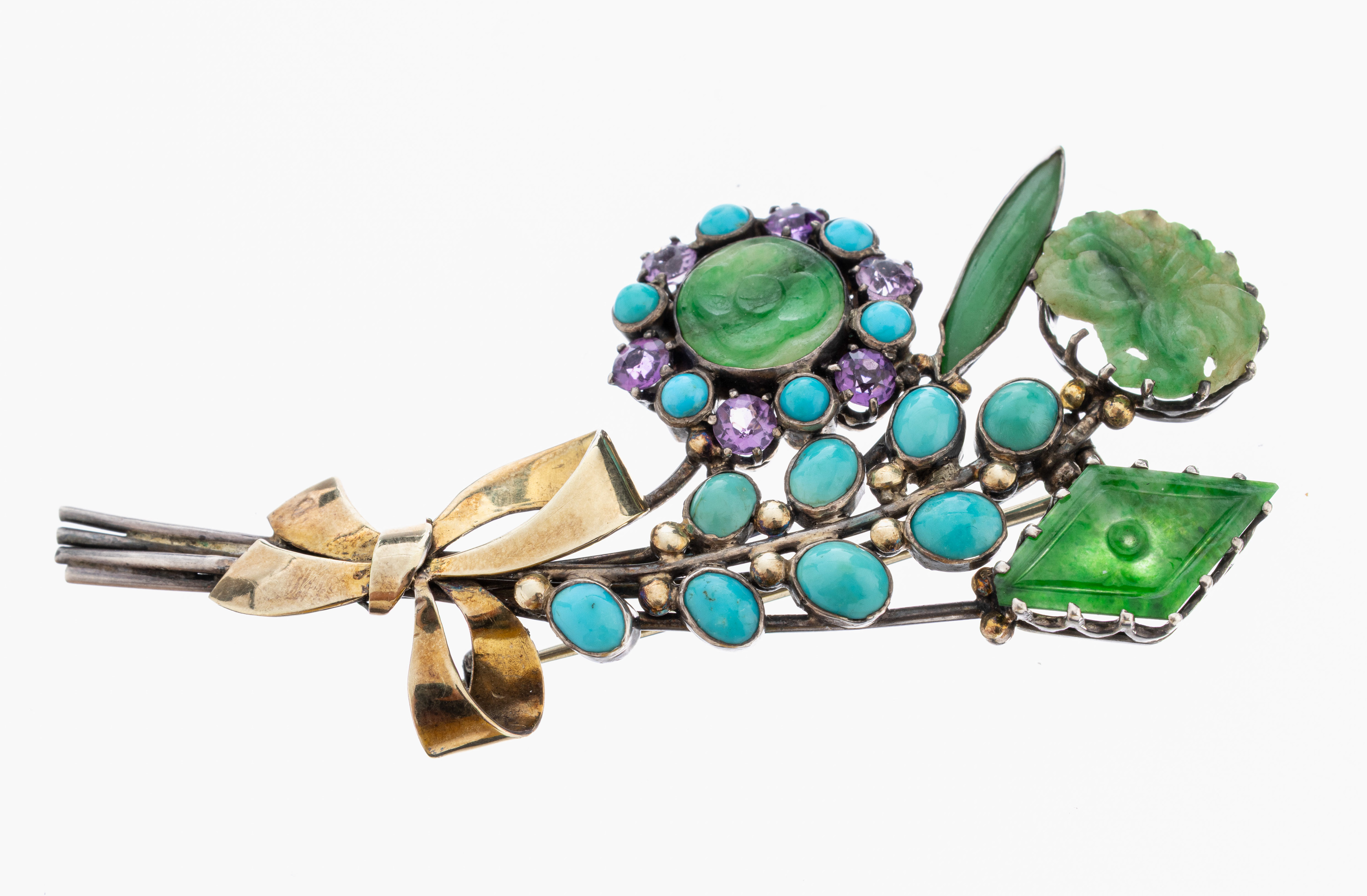Türkis-Jade-Amethyst-Brosche, Silber gepr.,part. verg., Darstellung eines Blumenstrauß,