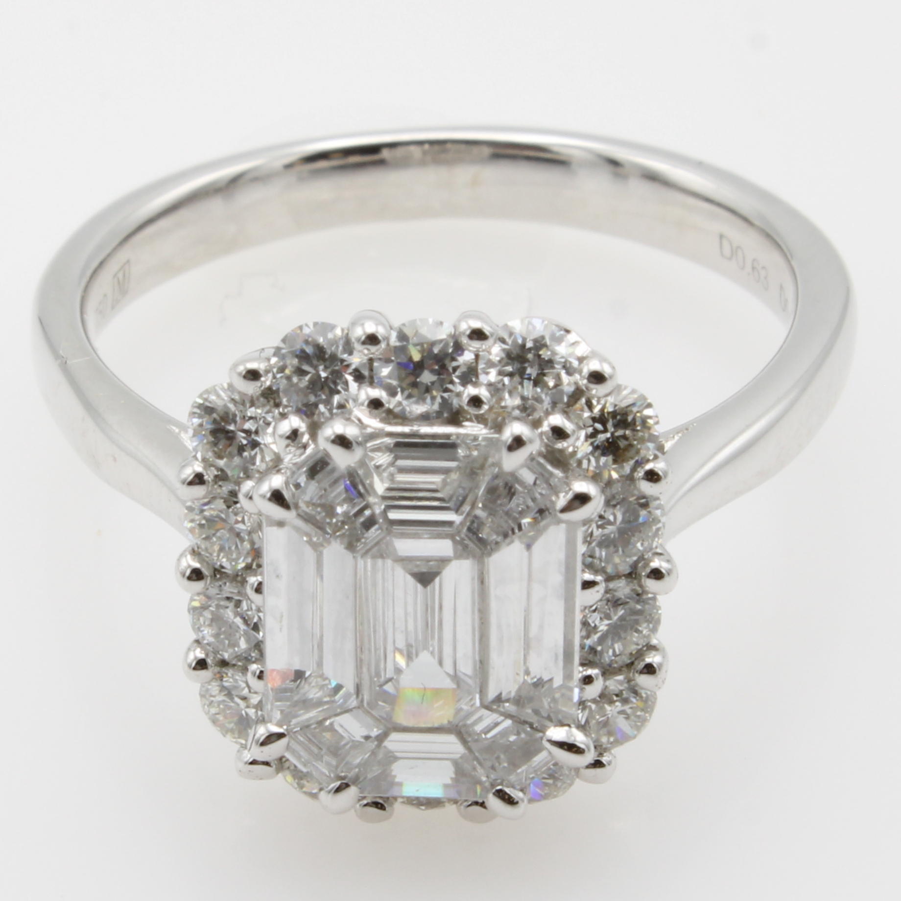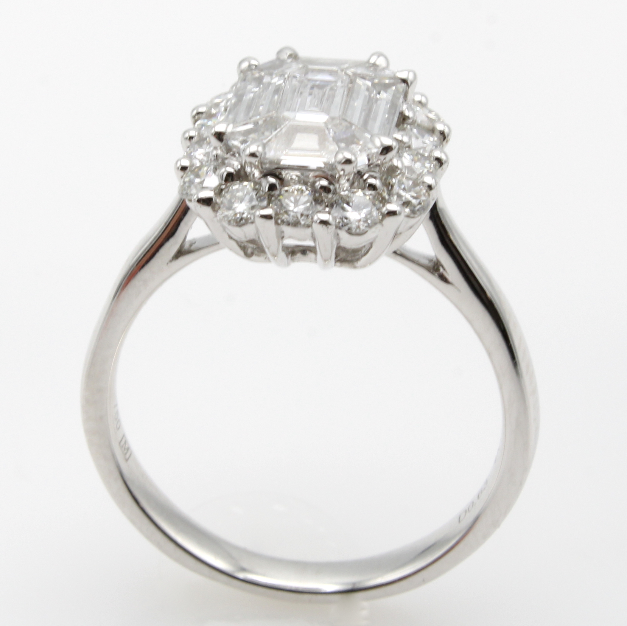 Ring mit Diamanten und Brillanten, WG 750/ 000, 9 Diam. im Smaragdschliff zus. ca. 0.85 ct u. 14 Brill. zus. ca. 0.63 ct feines Weiß/ vvs-vs, RW ca. 53 Schätzpreis: 9500, - EUR