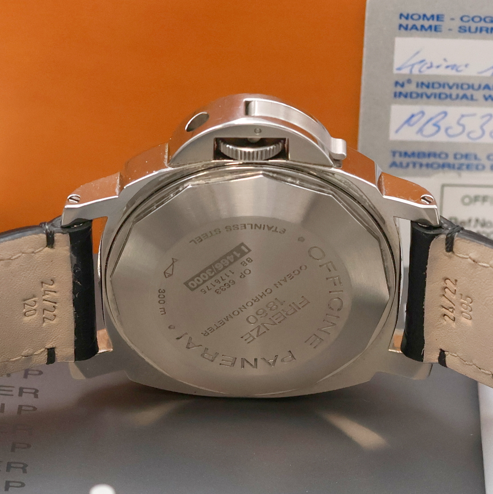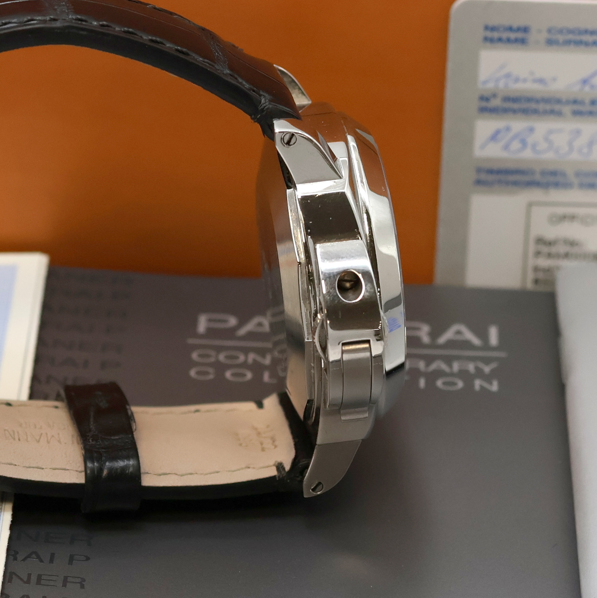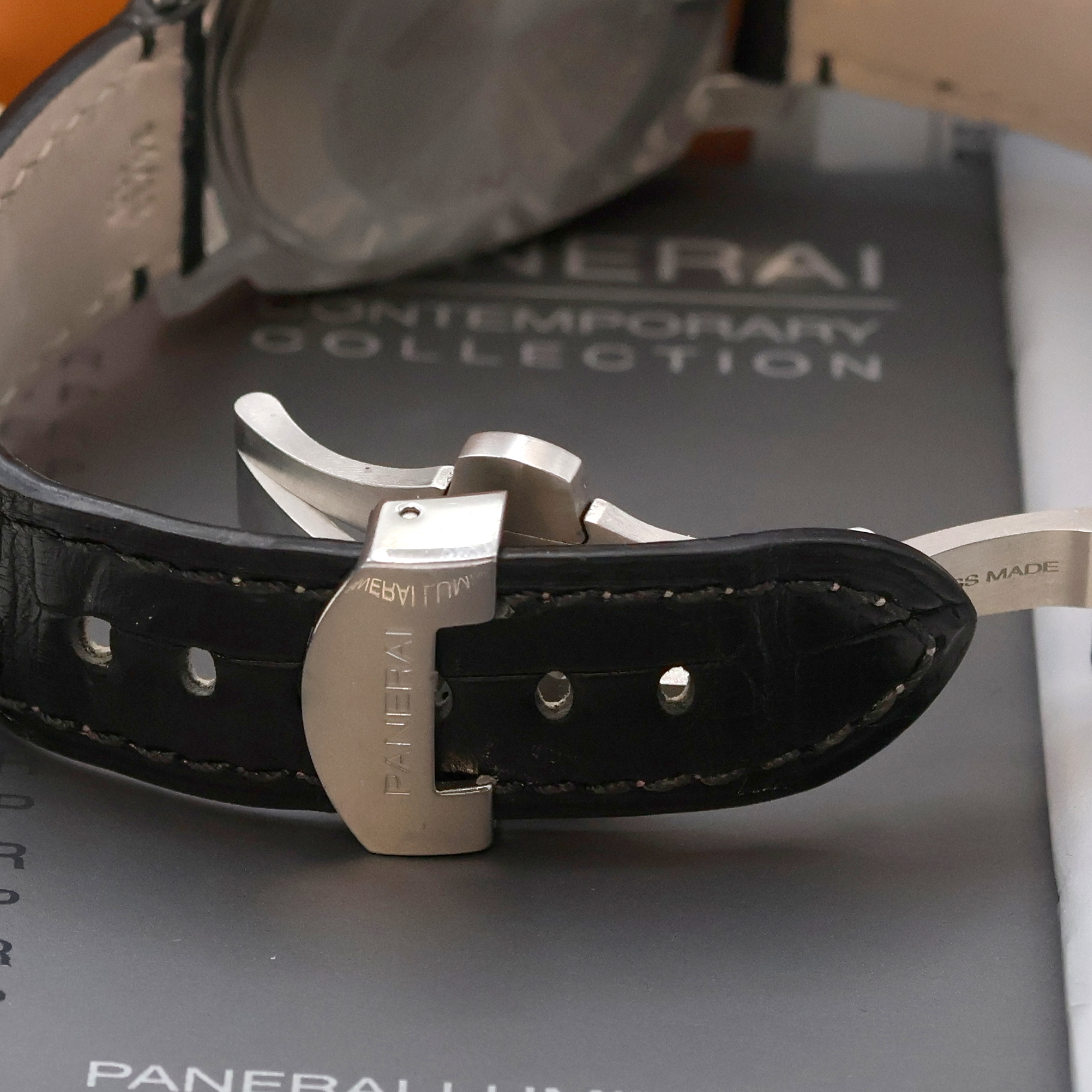 Edelstahlgeh. inkl. neutr. Lederband m. orig. dopp. Faltschl., Krone unter Schwenkhebel,