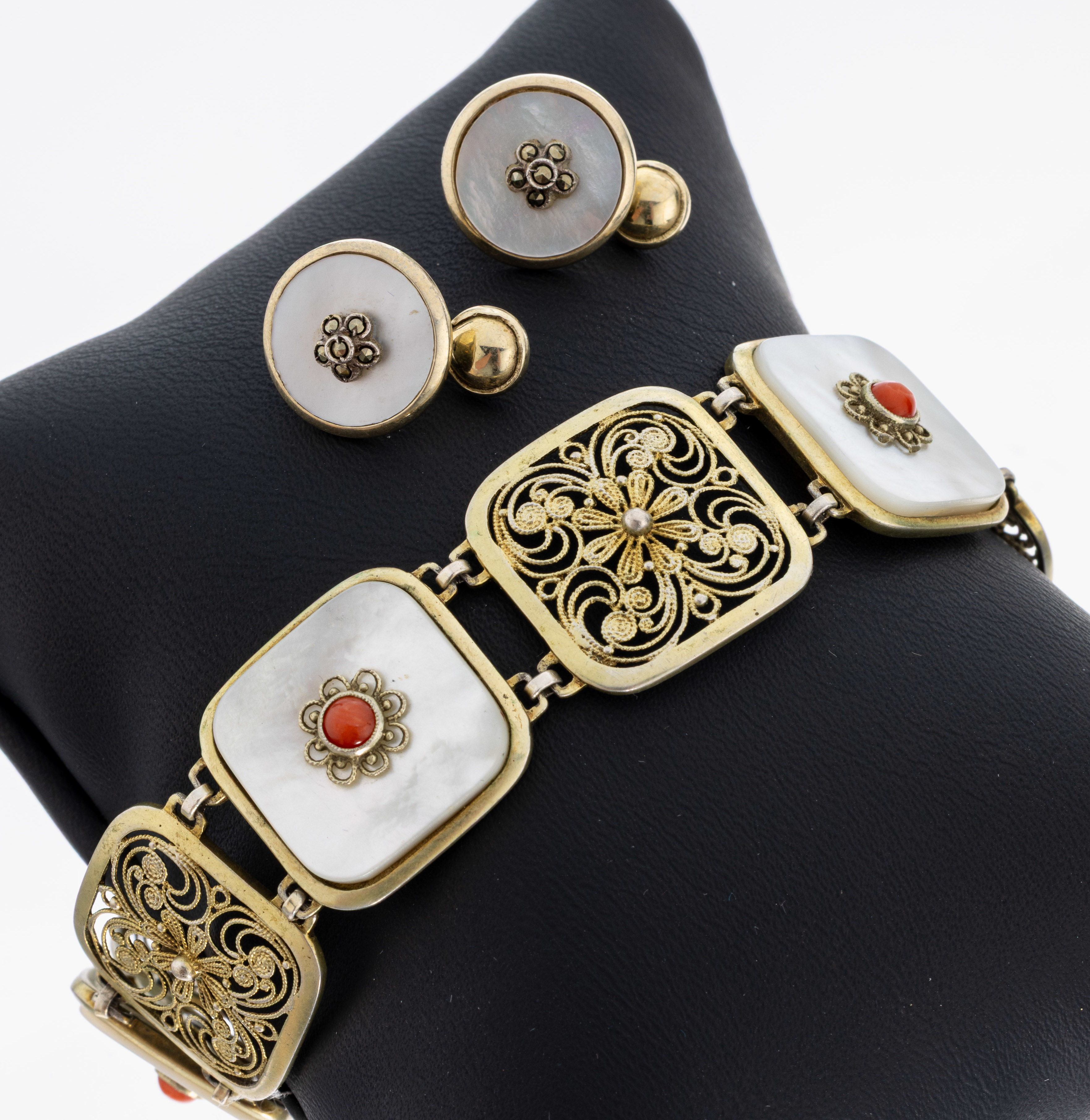 Perlmutt-Korallen-Armband, 800er Silber, verg., Vergoldung part. berieben, quadratischeGlieder