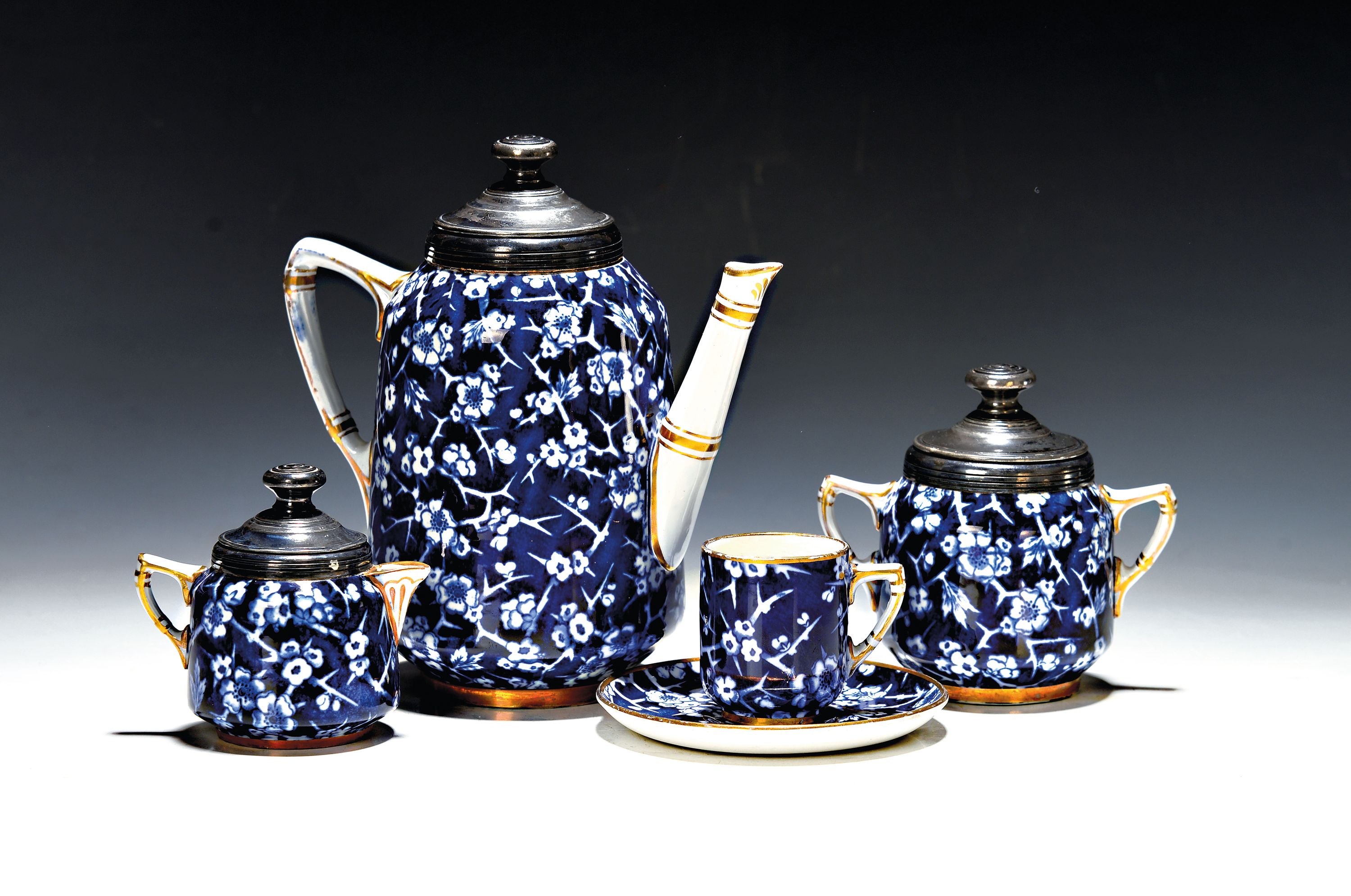 versilbert, blaugrundiger Blütenzweigdekor in chinoiser Manier, 8 Tassenmit UT,