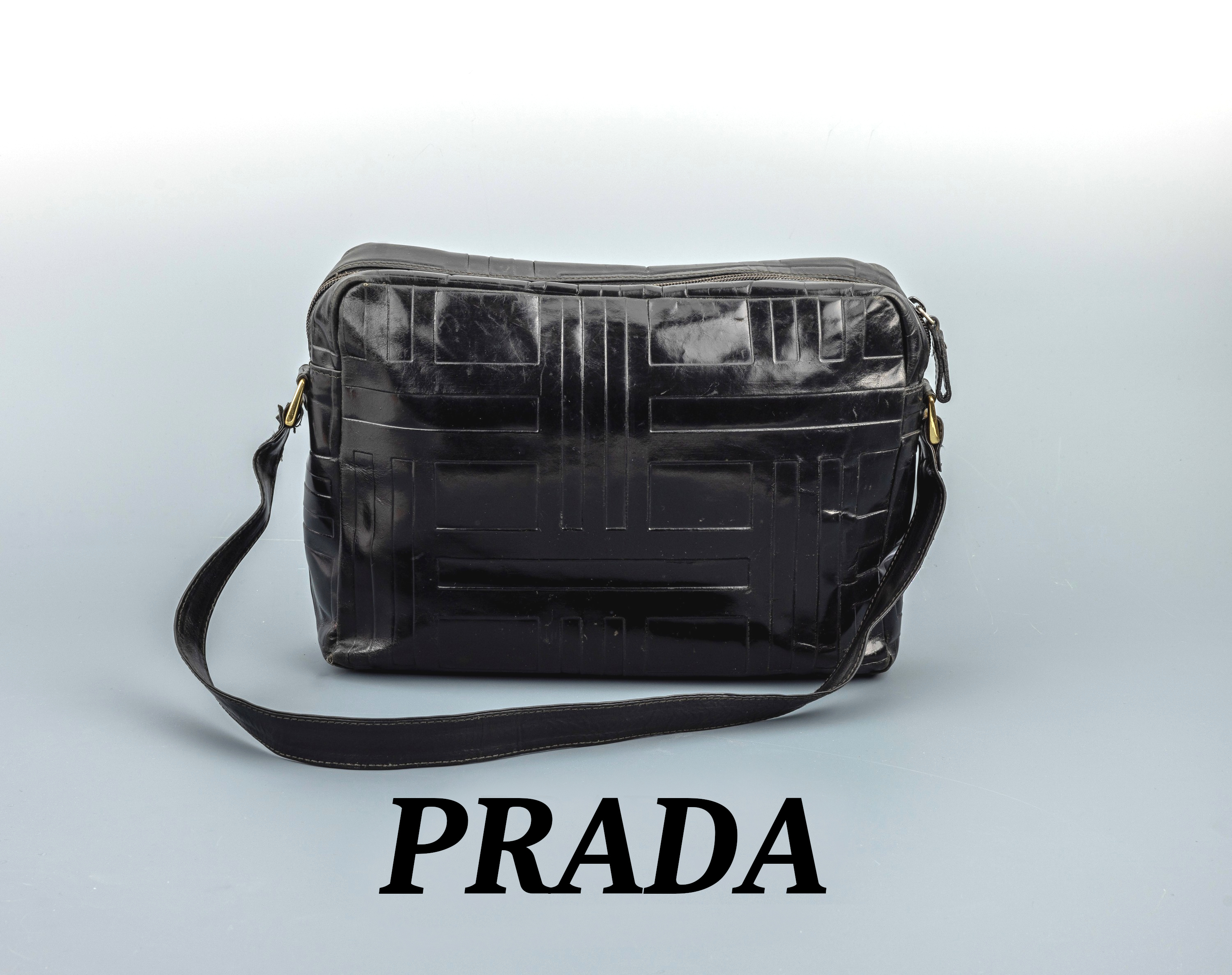 PRADA Vintage Tasche, schwarzes Glattleder,strukturierte Musterung, 1 Tragehenkel,