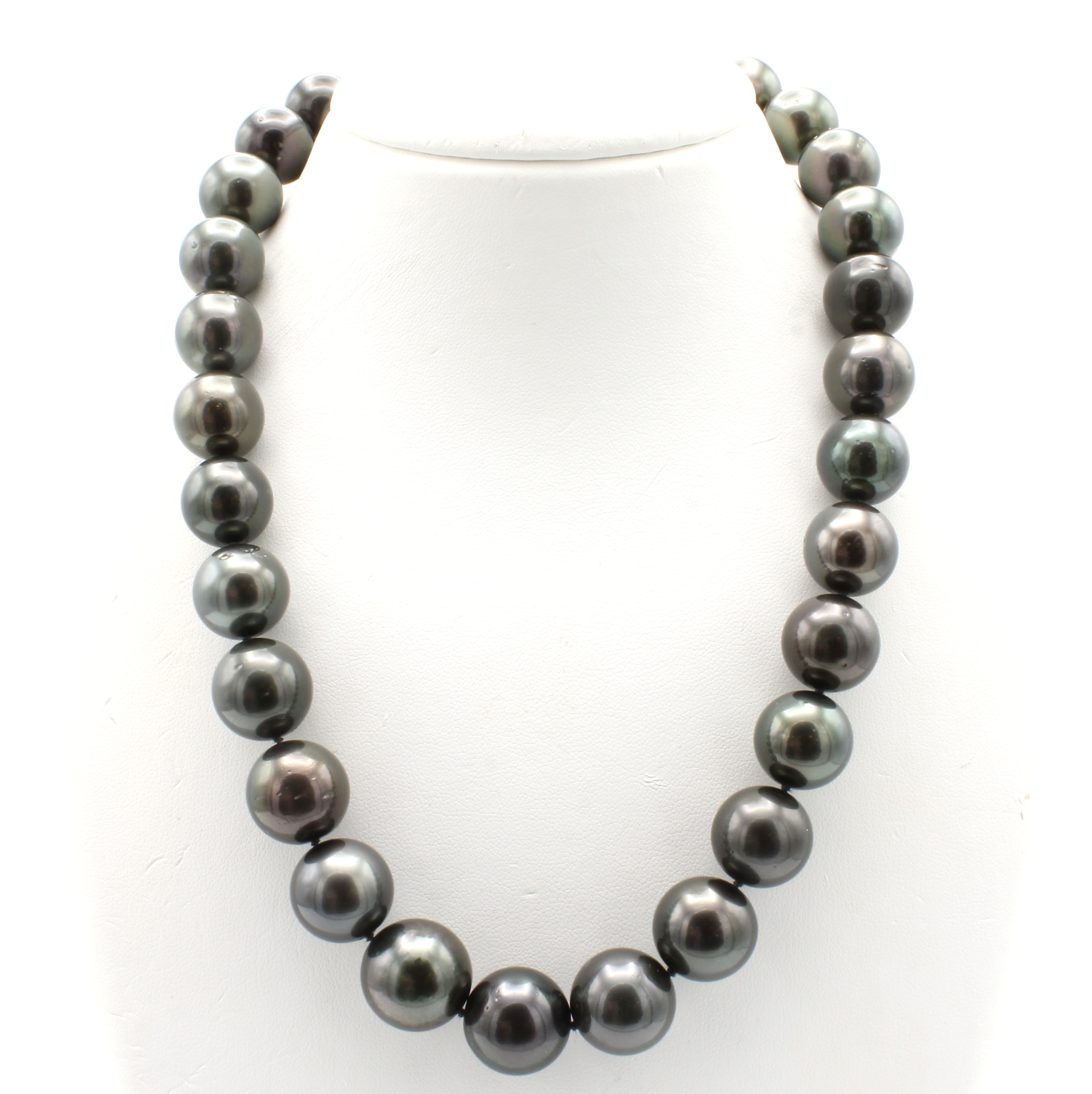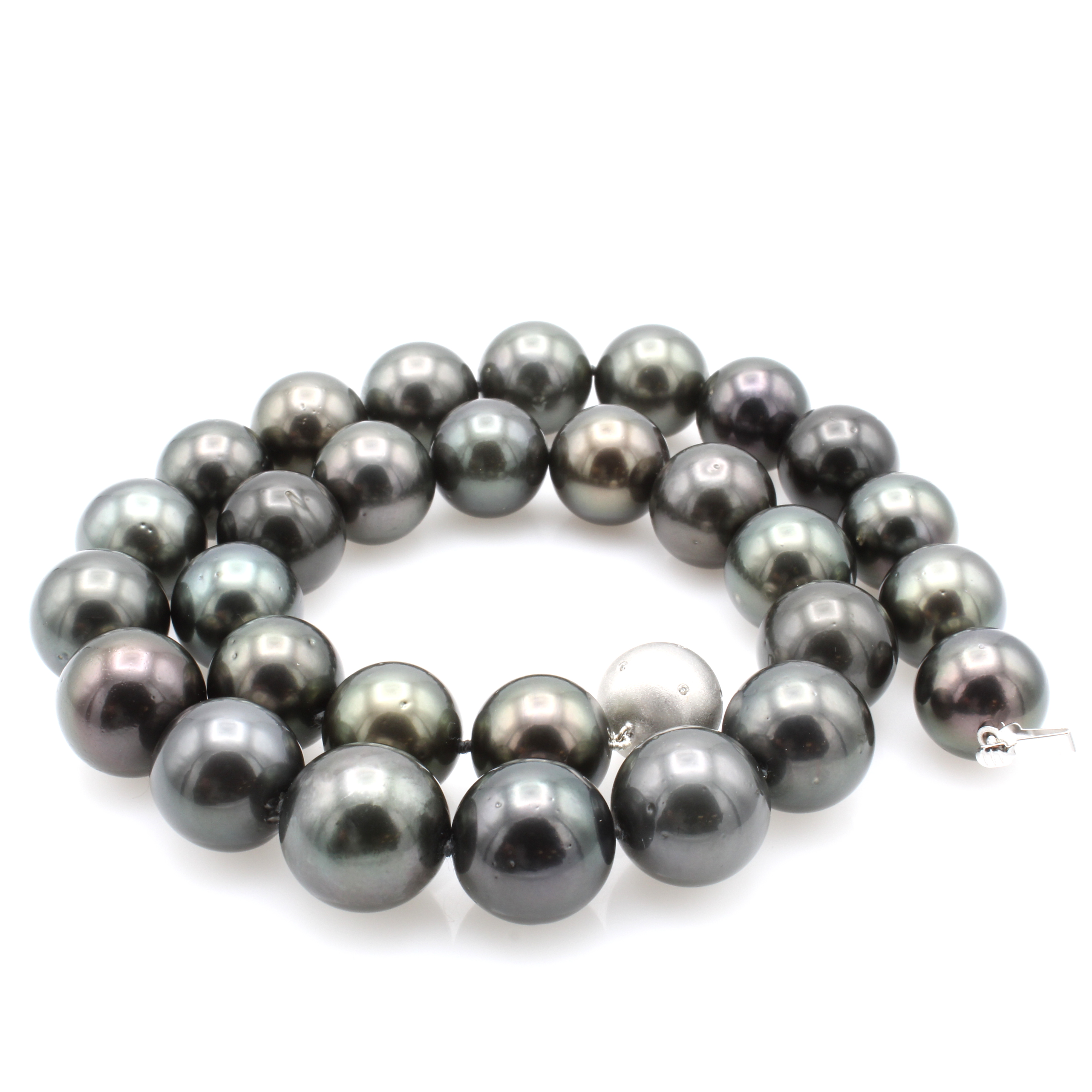 Tahitizuchtperlcollier, Kugelschl. WG 585/ 000 bes. m. kl. Diam. zus. ca. 0.06 ct Weiß/si, dunkle Perlen m. grünsilberfarb. Überton, D. ca. 14-16.2 mm, L. ca. 47 cm Schätzpreis: 11000, - EUR