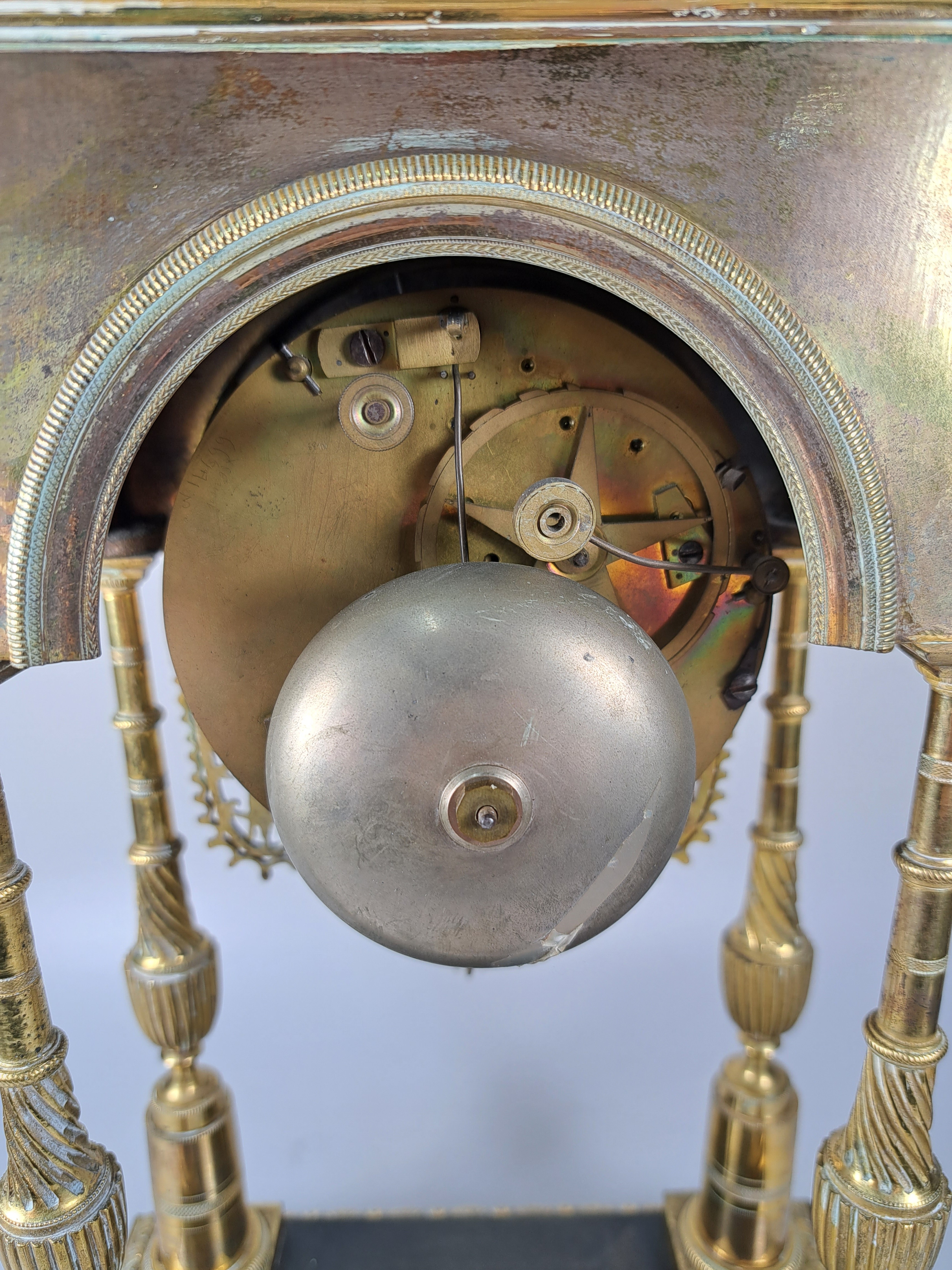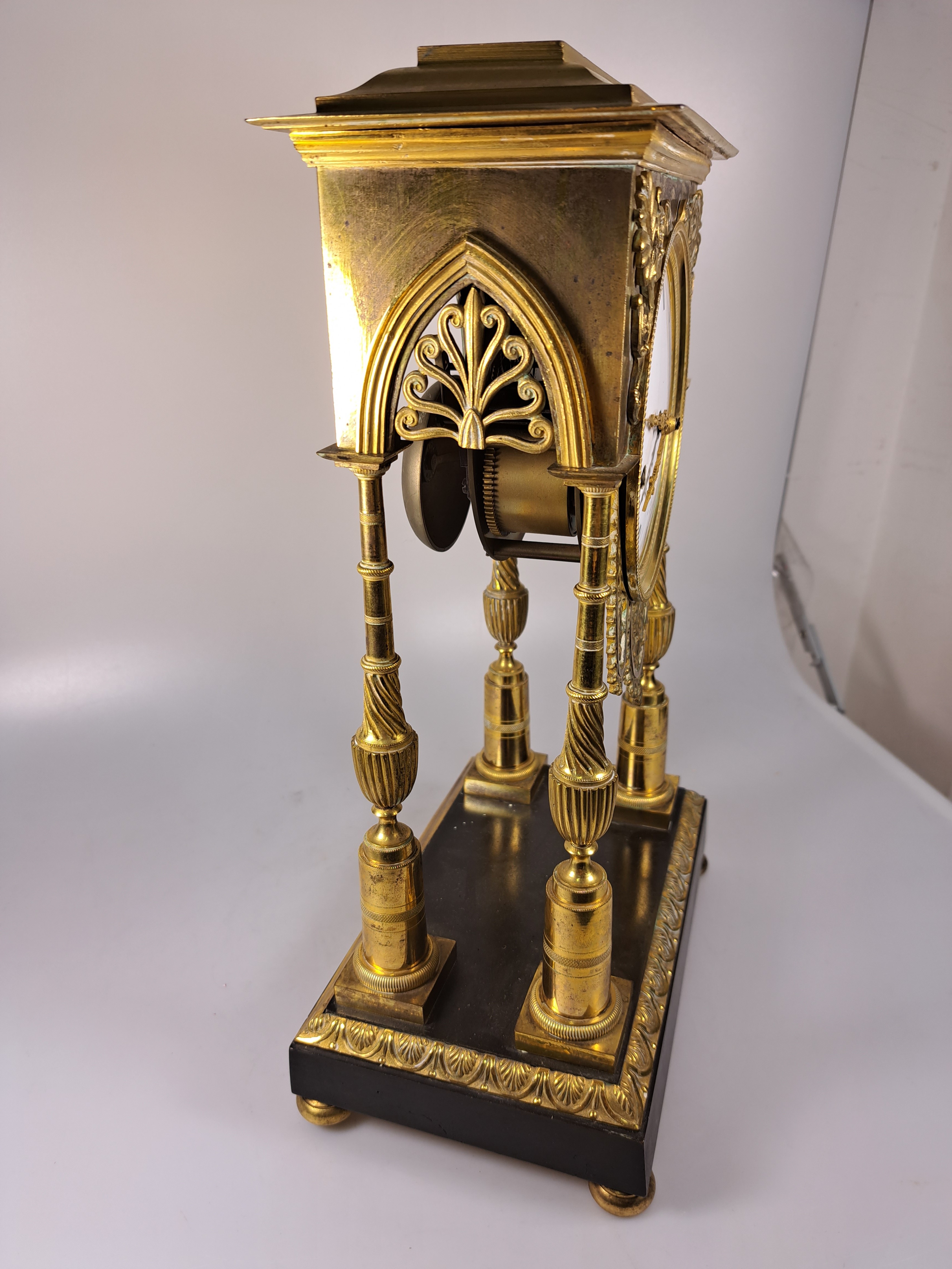 Uhr getragen von 4 filigranen Säulen, in den Ecken Palmetten, mit Lambrequin, seitlich