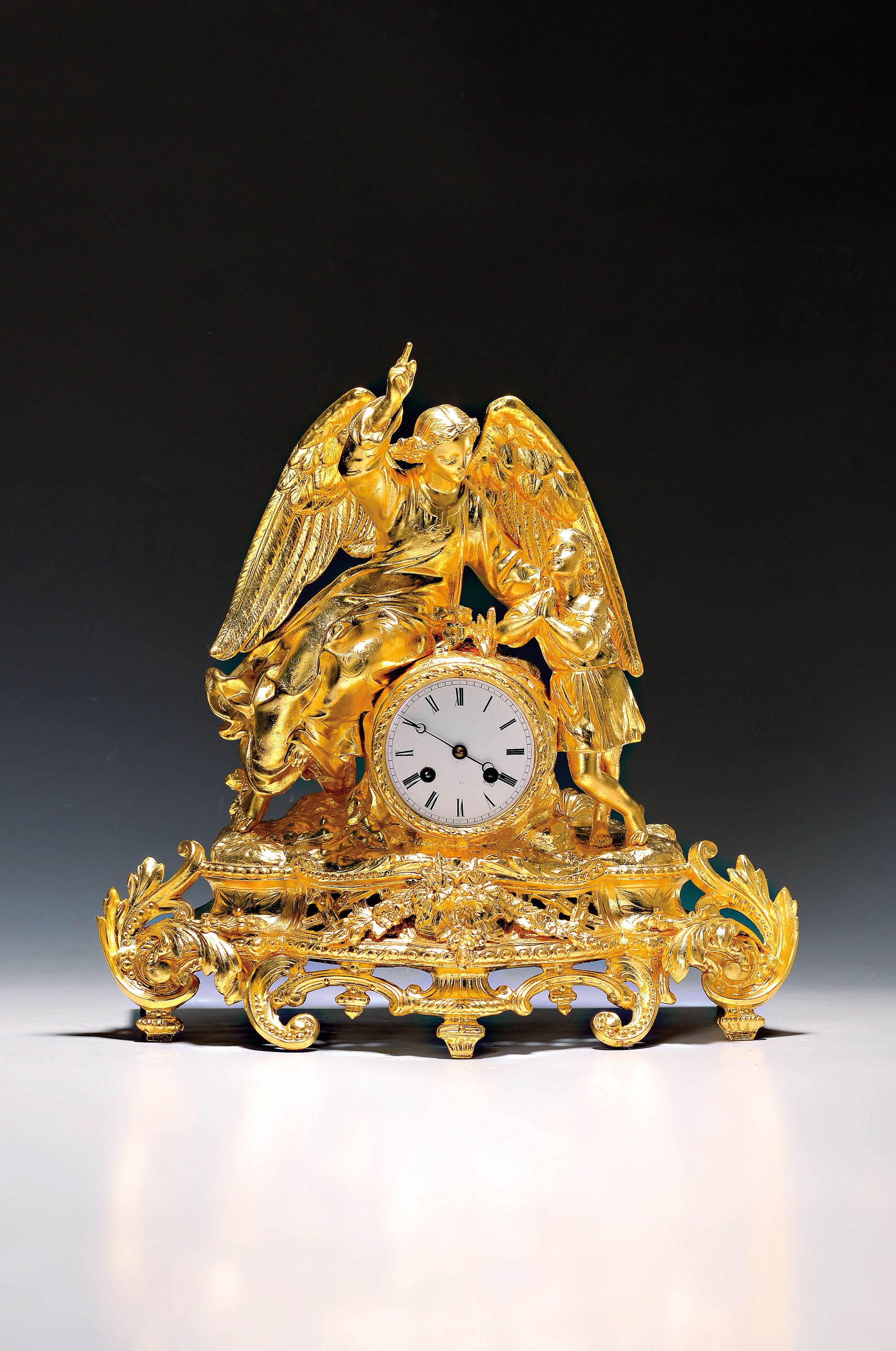 Regulle nach vergoldet, Engelbekrönung, Emailzifferblatt, Pendulenwerk gem.: S.