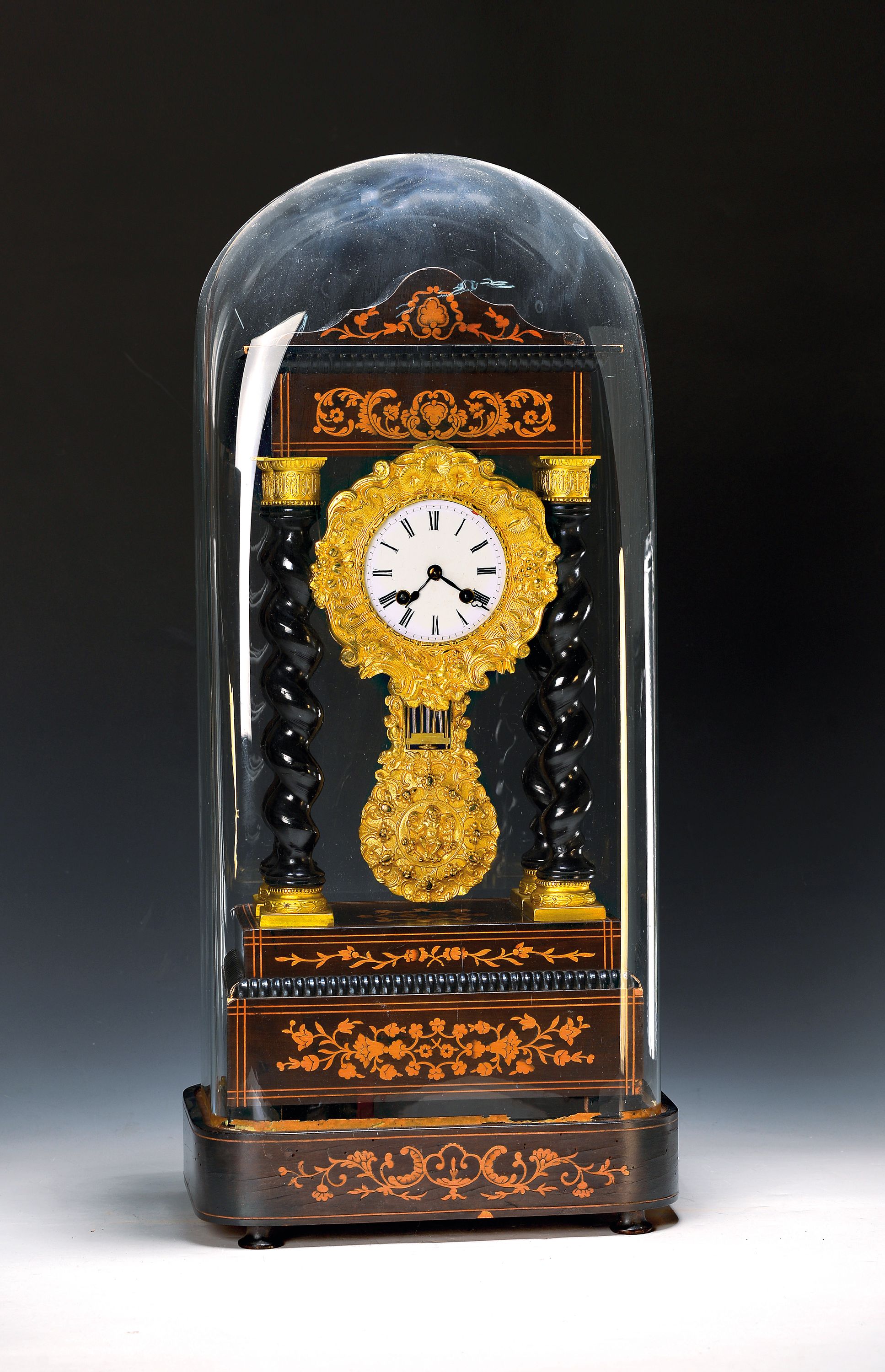 Portaluhr mit Glasdom, Frankreich, um 1870, orig. Mineralglasdom, Sockel mit Marketierung,Holzgehäuse ebenfalls marketiert, gedrehte Säulen, verzierte Lünette und Pendel, beides mit Bachanten, Emailzifferblatt, Stundenzeigersek., Pendulenwerk gem.: Japy, Halbstd. Schlagauf Glocke, Werk zu revidieren, Gesamthöhe ca.64cm, WZ/GZ 3-4