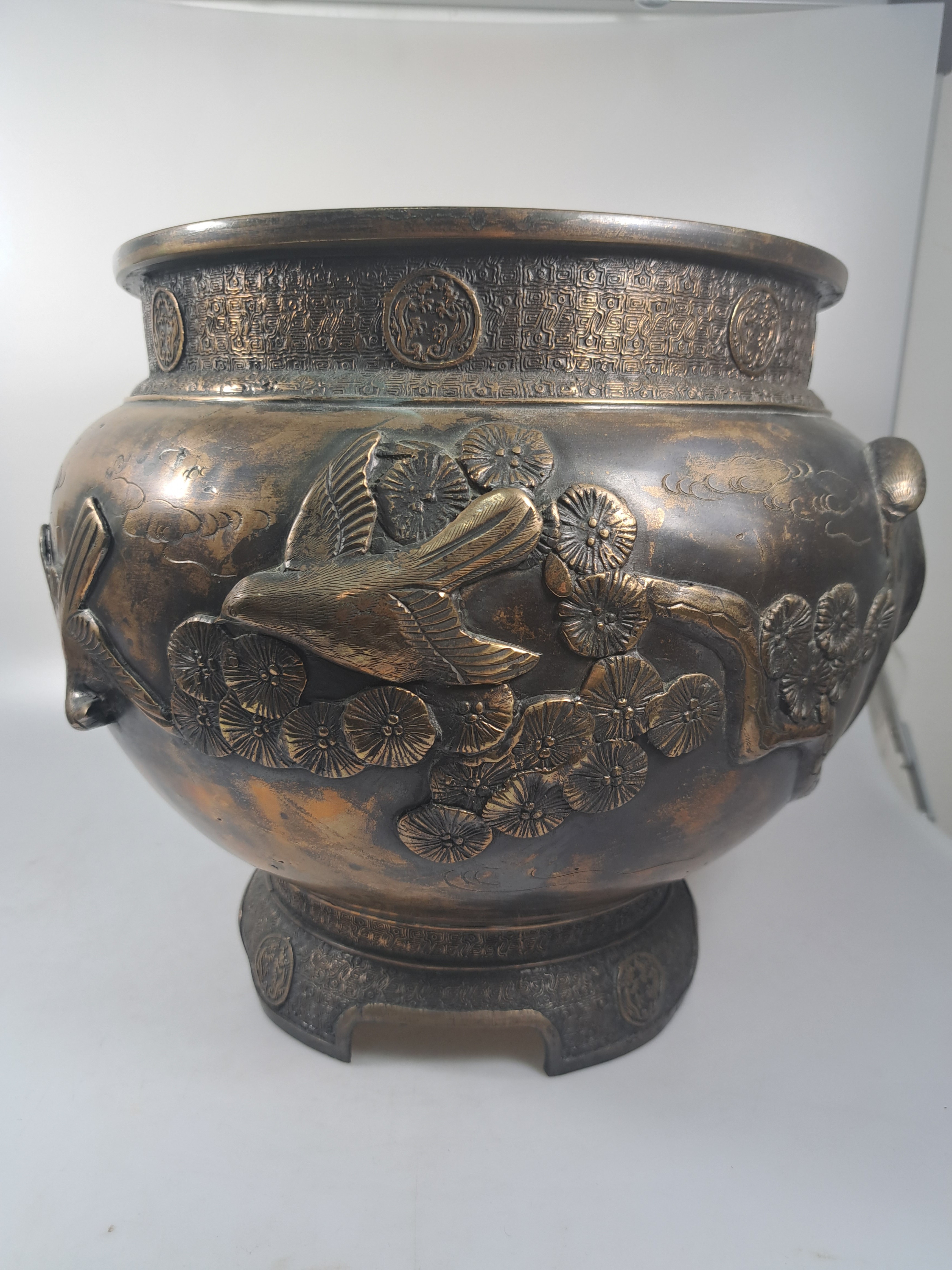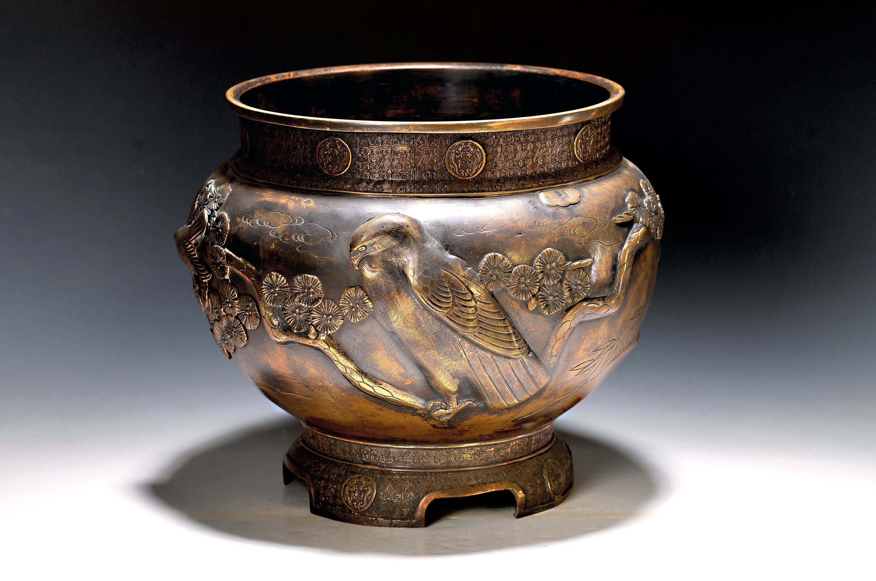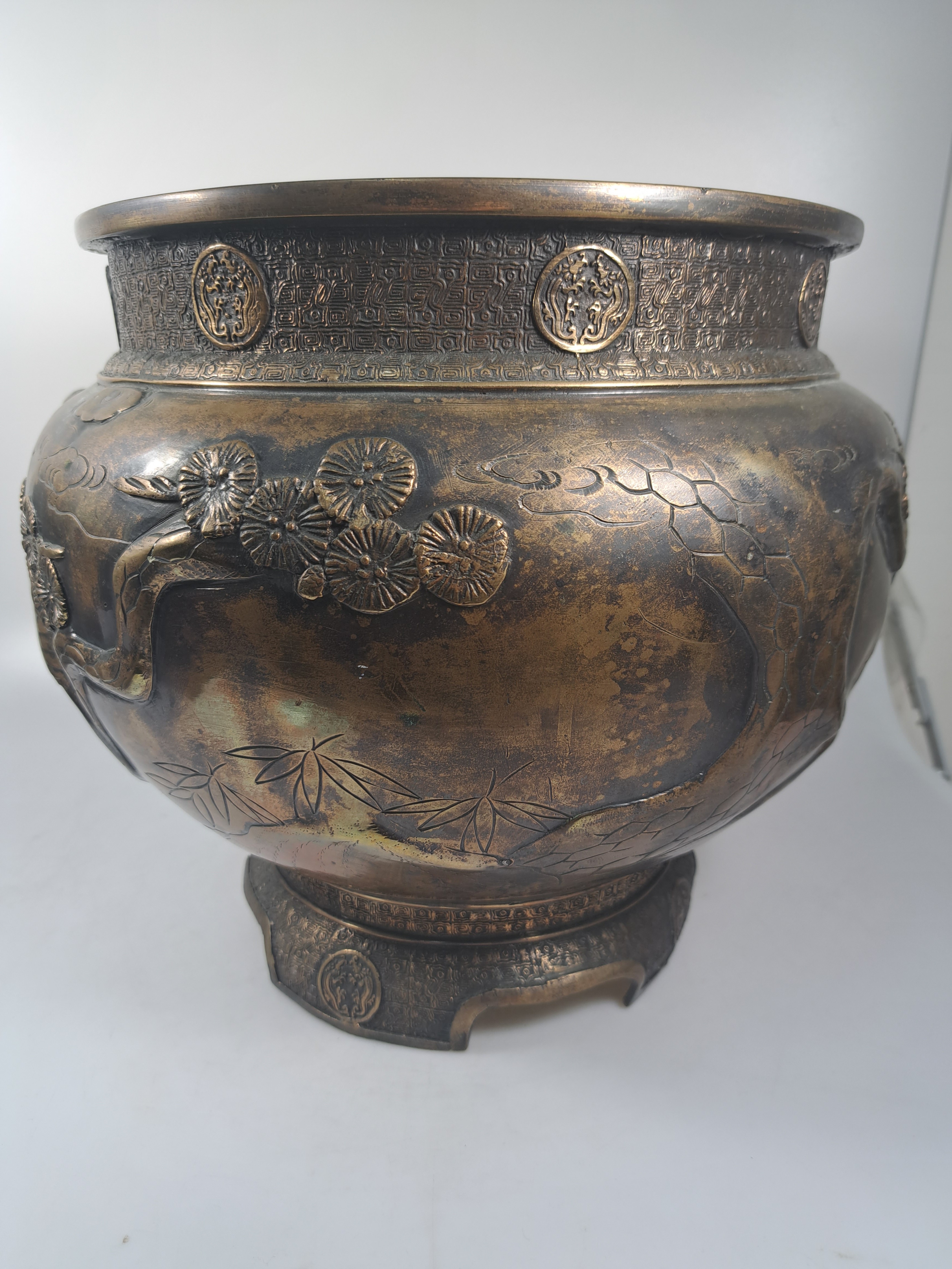 Bonsaitopf, Japan, späte Meiji oder Taisho -Zeit, Bronze, umlaufende Reliefzier