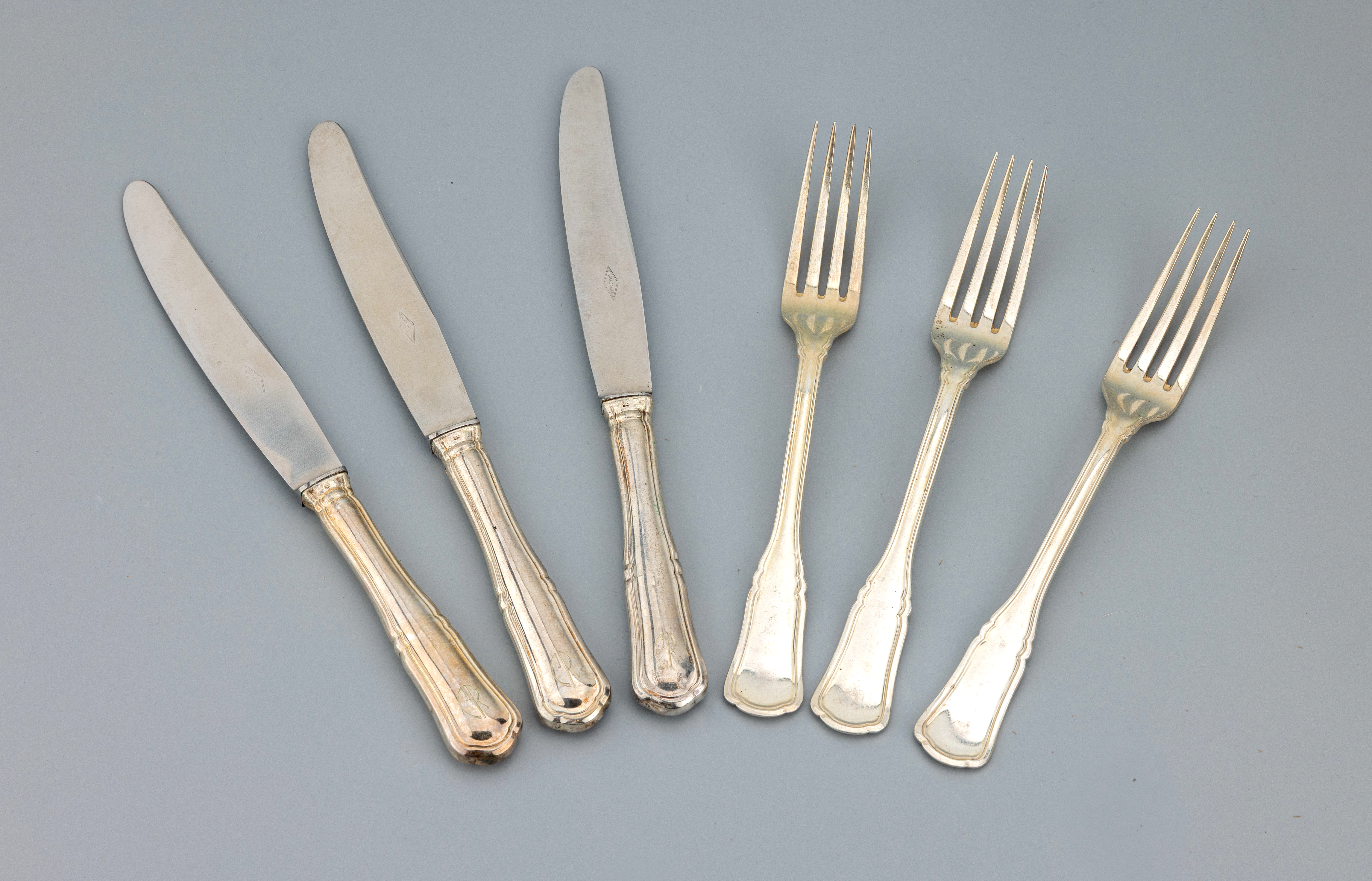 24 tlg. Besteck, 800er Silber, best. aus: 12 Menuegabeln und 12 Menuemesser, Griffe