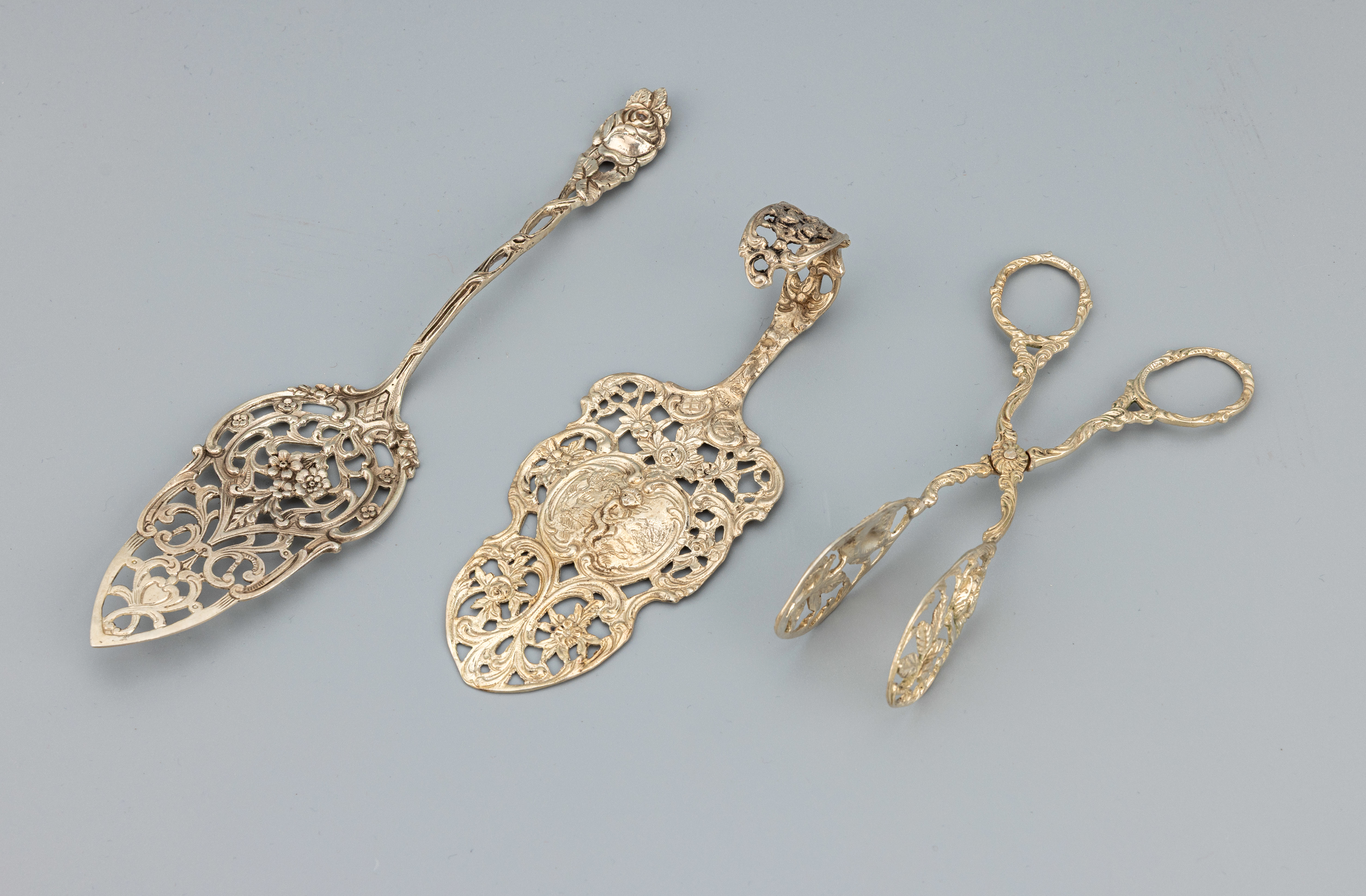 Konvolut 3 Vorlegeteile, best. aus: 2 Pastetenheber, 1 x 800er Silber, floral, Stielmit
