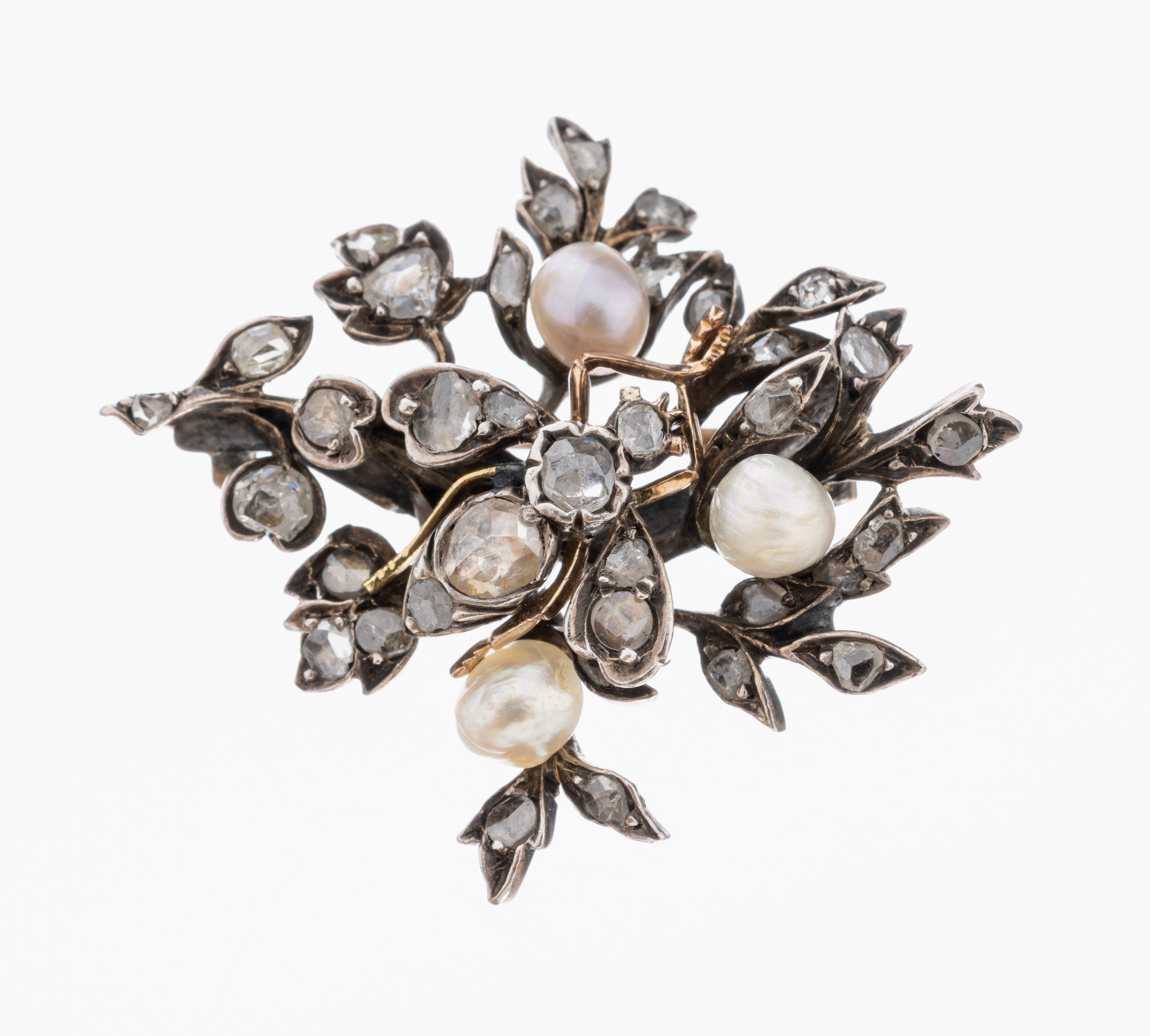 florale Gestaltung mit Fliege, 34 Diamantrosenzus. ca. 0.42 ct, 3 unrunde Perlen,