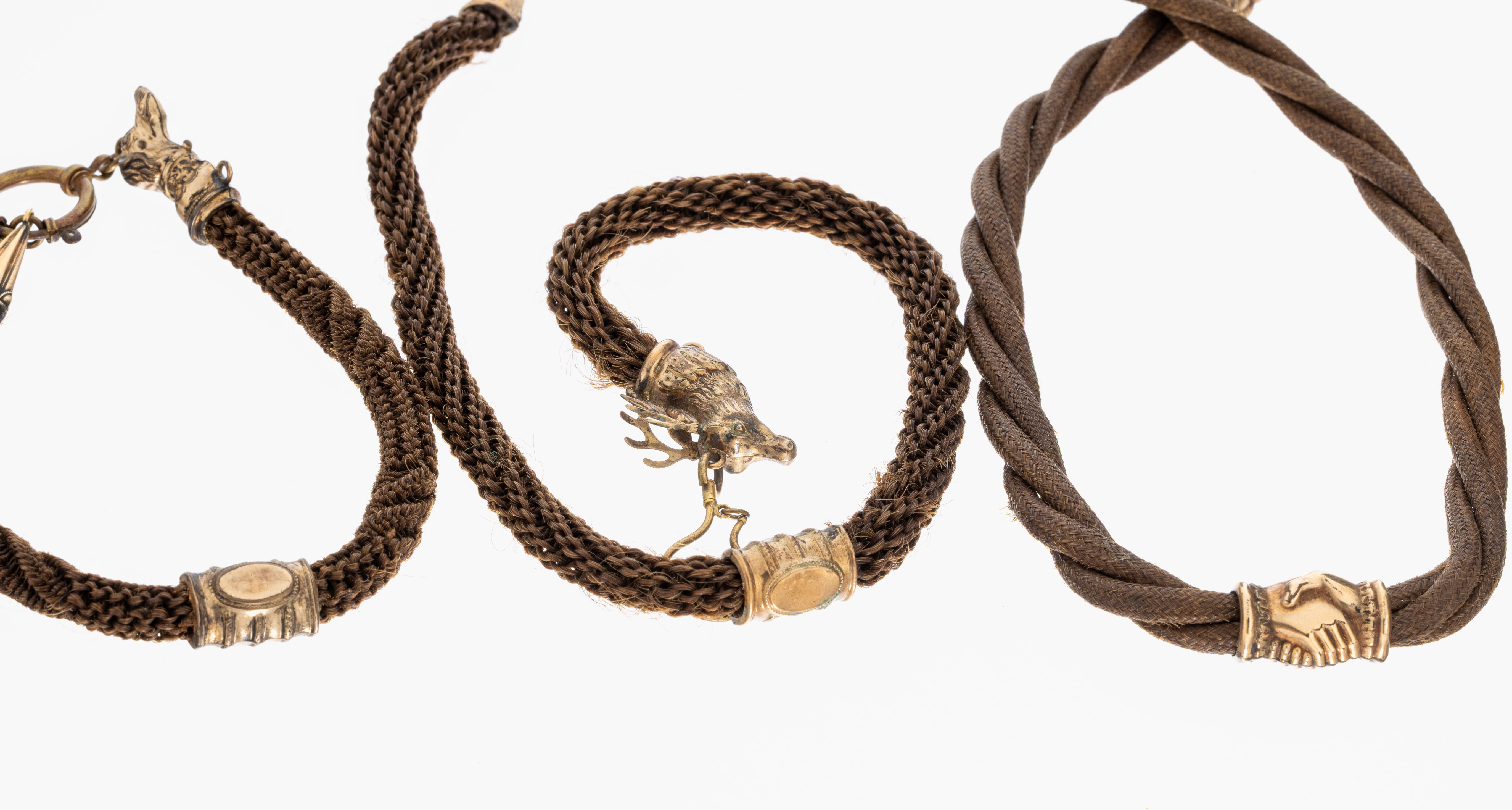 Konvolut 3 Uhrenketten aus Haargeflecht, um 1830-50, aufwändige Handarbeit, 1 x