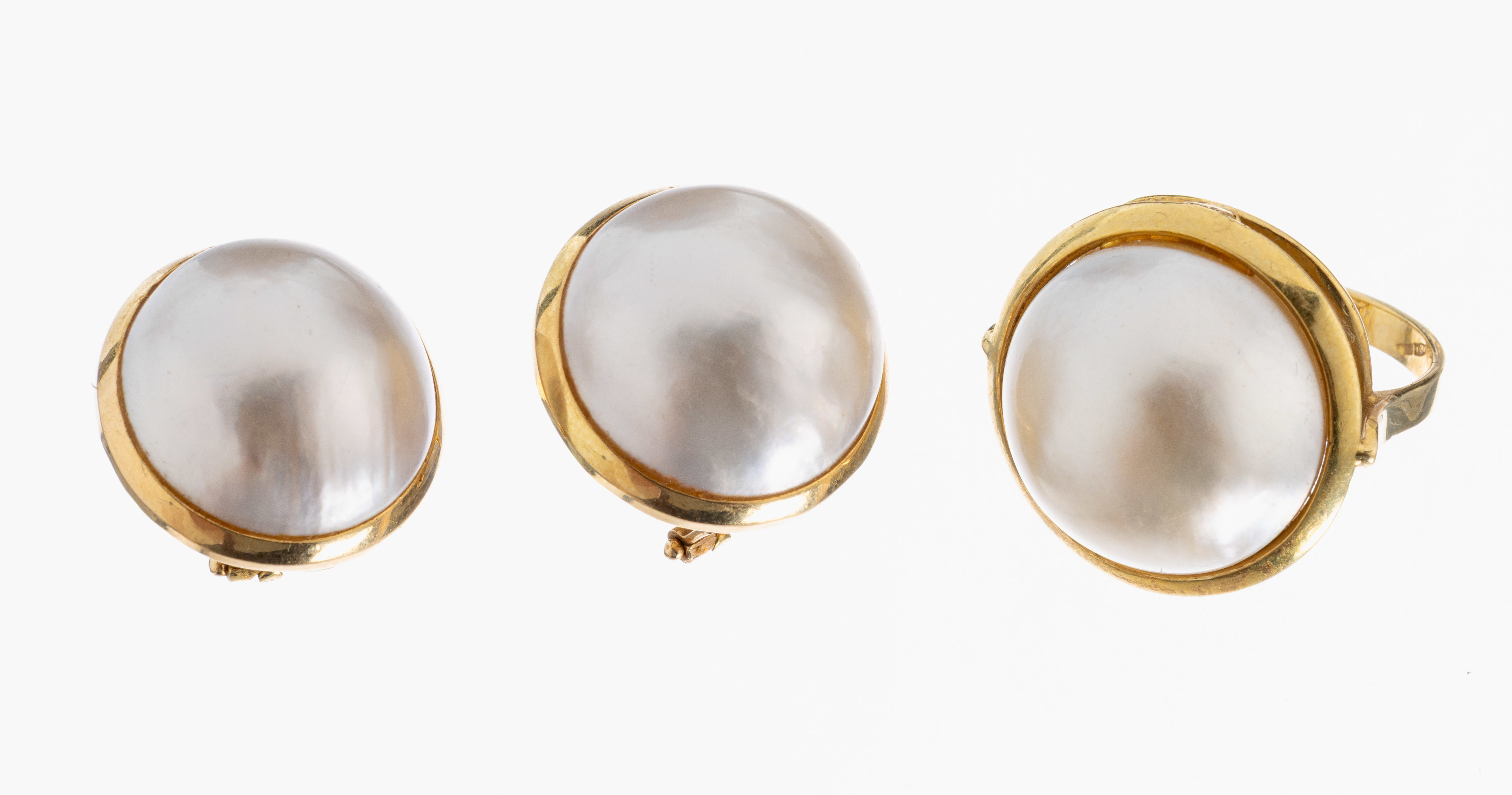 18 kt Gold Mabeperl-Schmuckset, GG 750/000,best. aus: Paar Ohrstecker, D. ca. 17.6