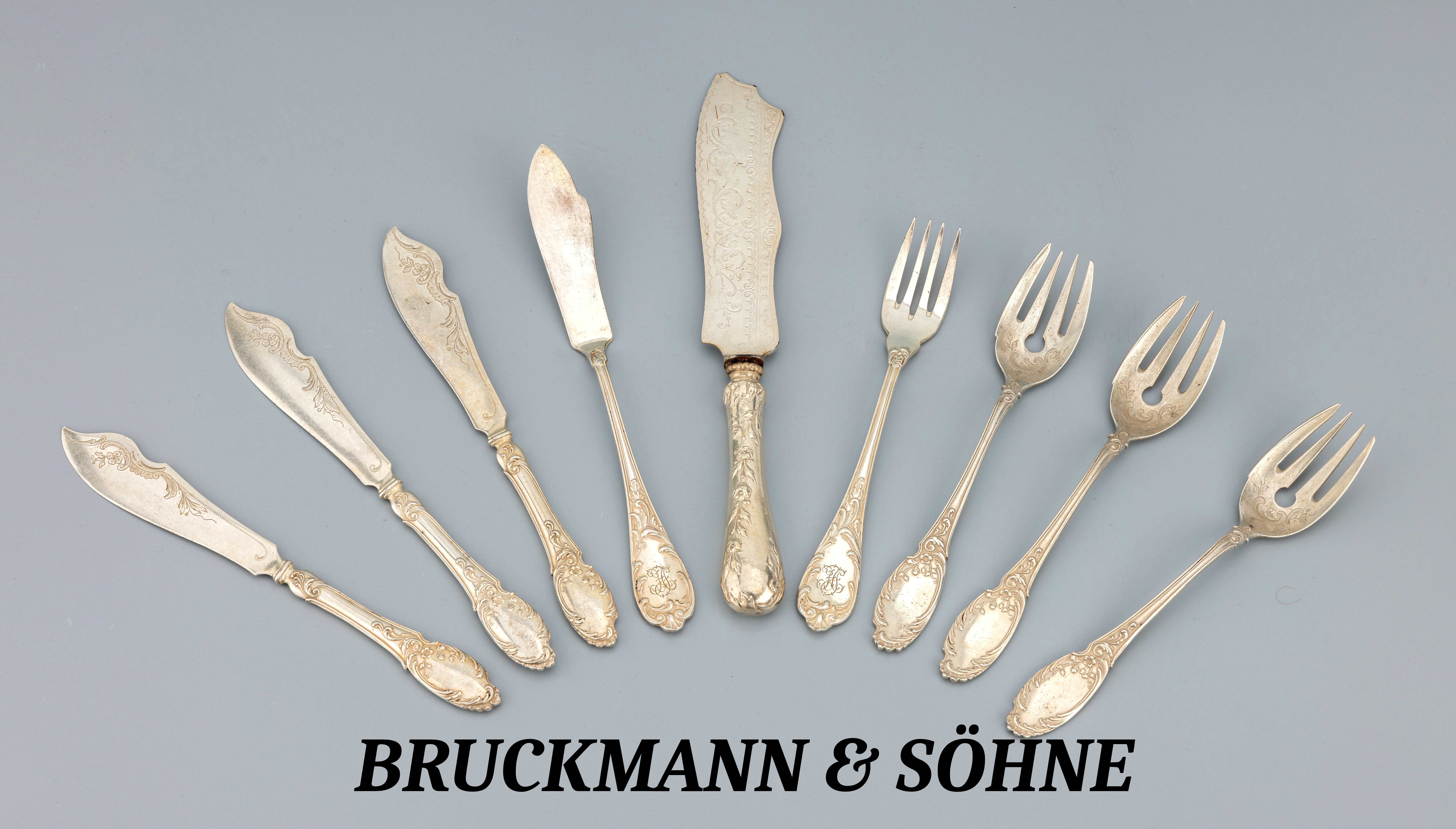 Fischbesteck für 3 Personen, Bruckmann & Söhne, 800er Silber, Rokoko-Entwurf mit freien Monogrammfeldern, 3 Messer, 3 Gabeln, Klingen floral grav., ca. 342 g, dazu 1 Vorlegemesser, Griff 800er Silber gefüllt, Klinge Stahl, starke Gebr.-Spuren, und 1 Besteckset, 1 Messer und 1 Gabel, versilbert, ähnliches Dekor, mit Monogramm wohl JH