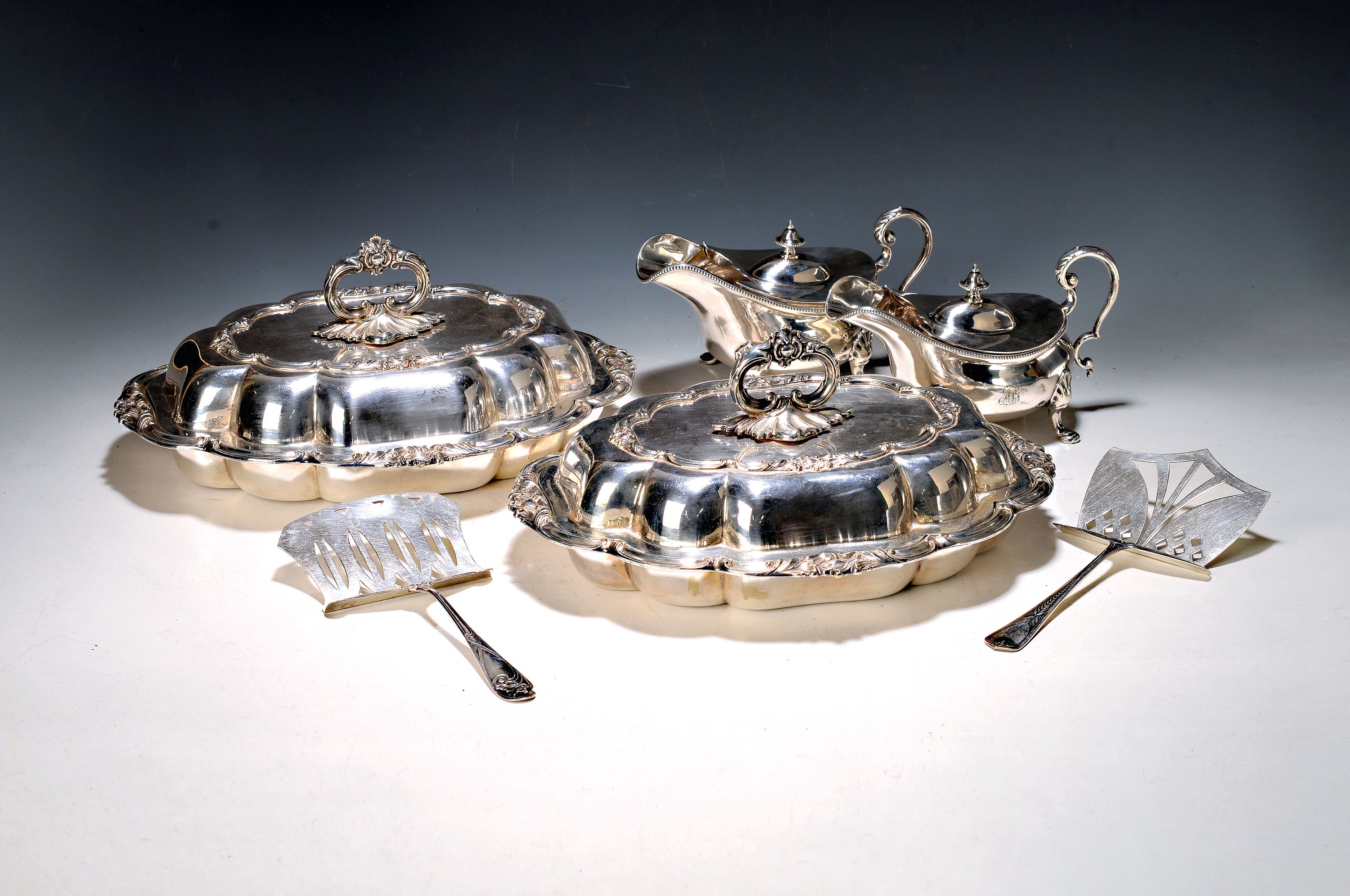 Servierschüsseln, Atkin Brothers Sheffield, 132x32x26 cm; Paar Saucieren, Henry