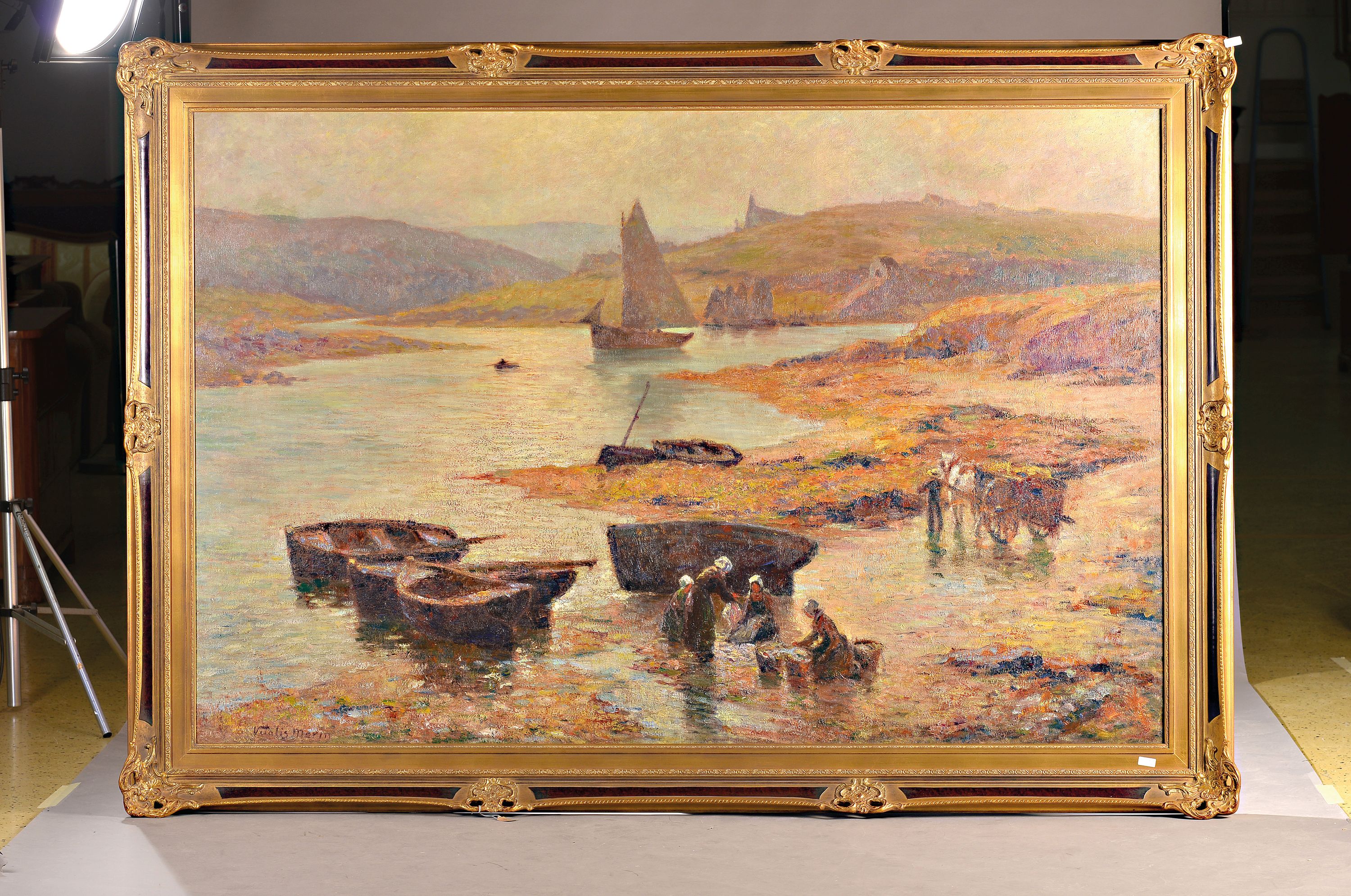 mit Wäscherinnen am Ufer, links unten signiert, Öl/Lwd, 138x205 cm, Prunkrahmen