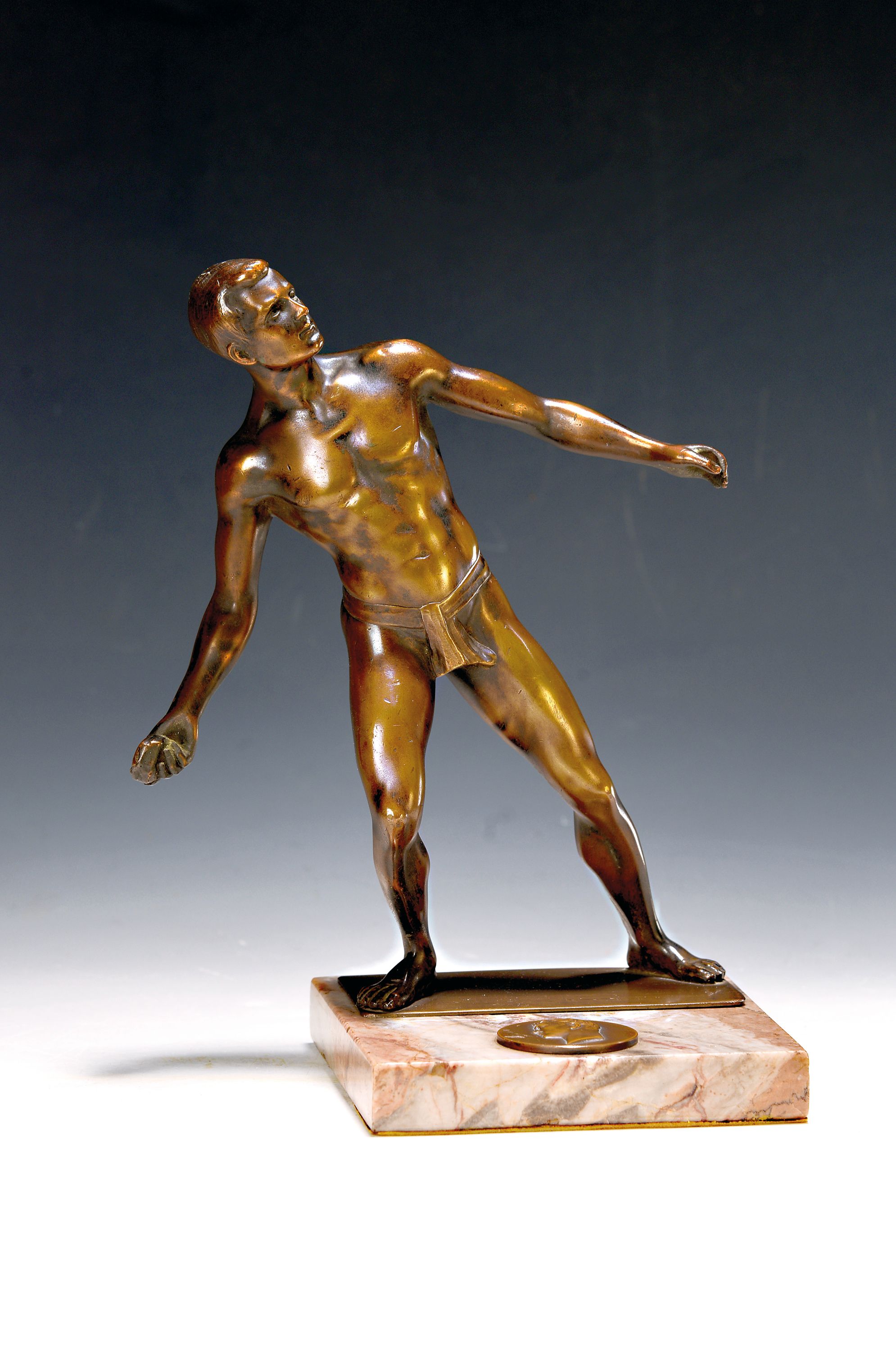 Bronzeskulptur Steinewerfer, wohl nach Hans Keck (1875-1941), Bronze patiniert, auf