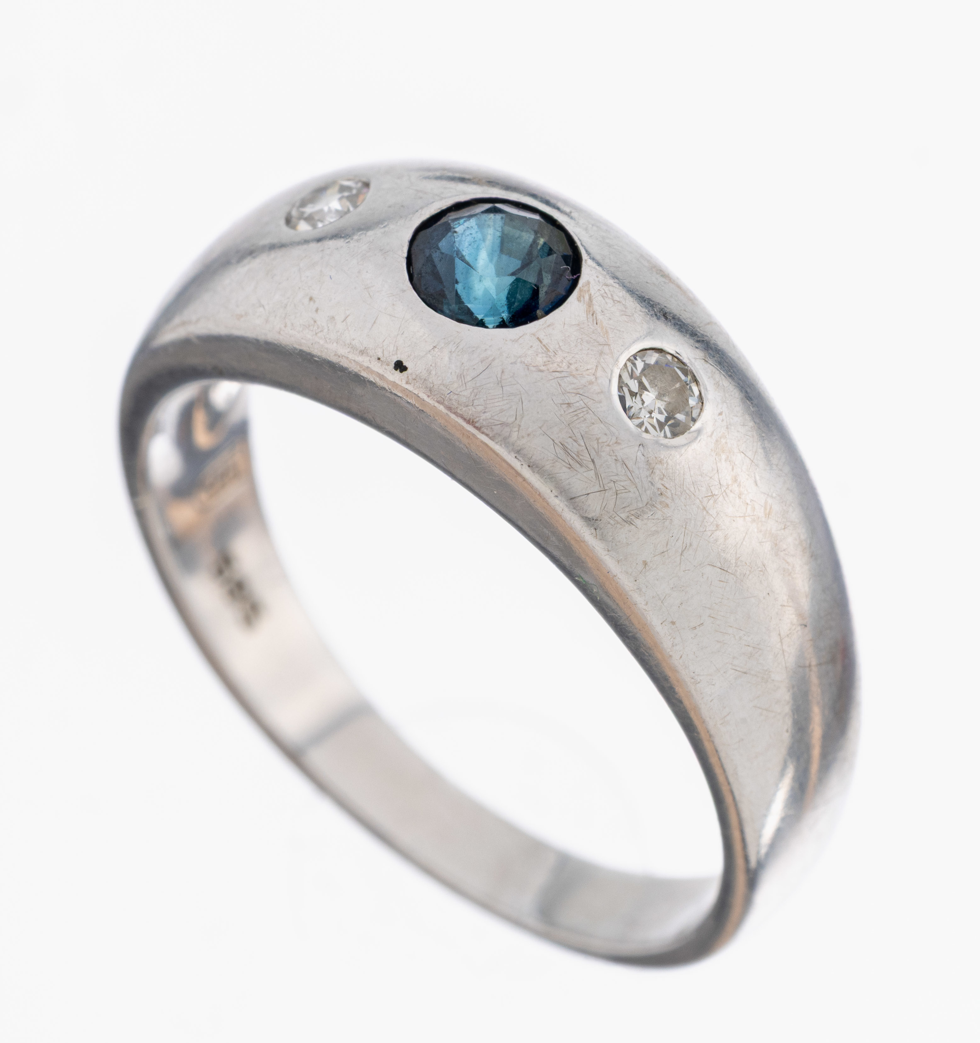 14 kt Gold Saphir-Brillant-Ring, WG 585/000, rundfacett. Saphir ca. 0.18 ct, 2 Brillanten