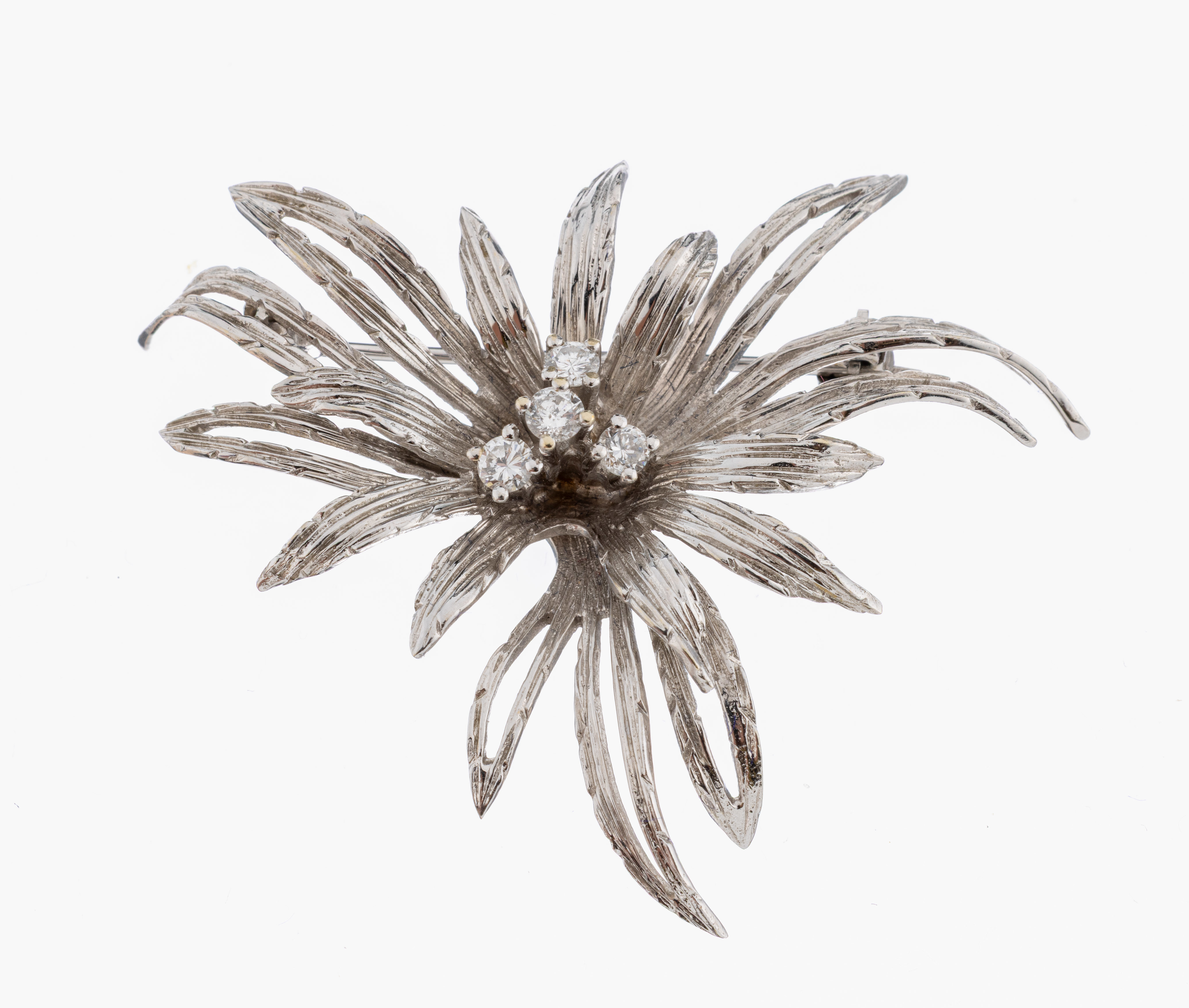 14 kt Gold Brillant-Brosche, 1960er-70er Jahre, WG 585/000, Blüte, Blätter strukt.,