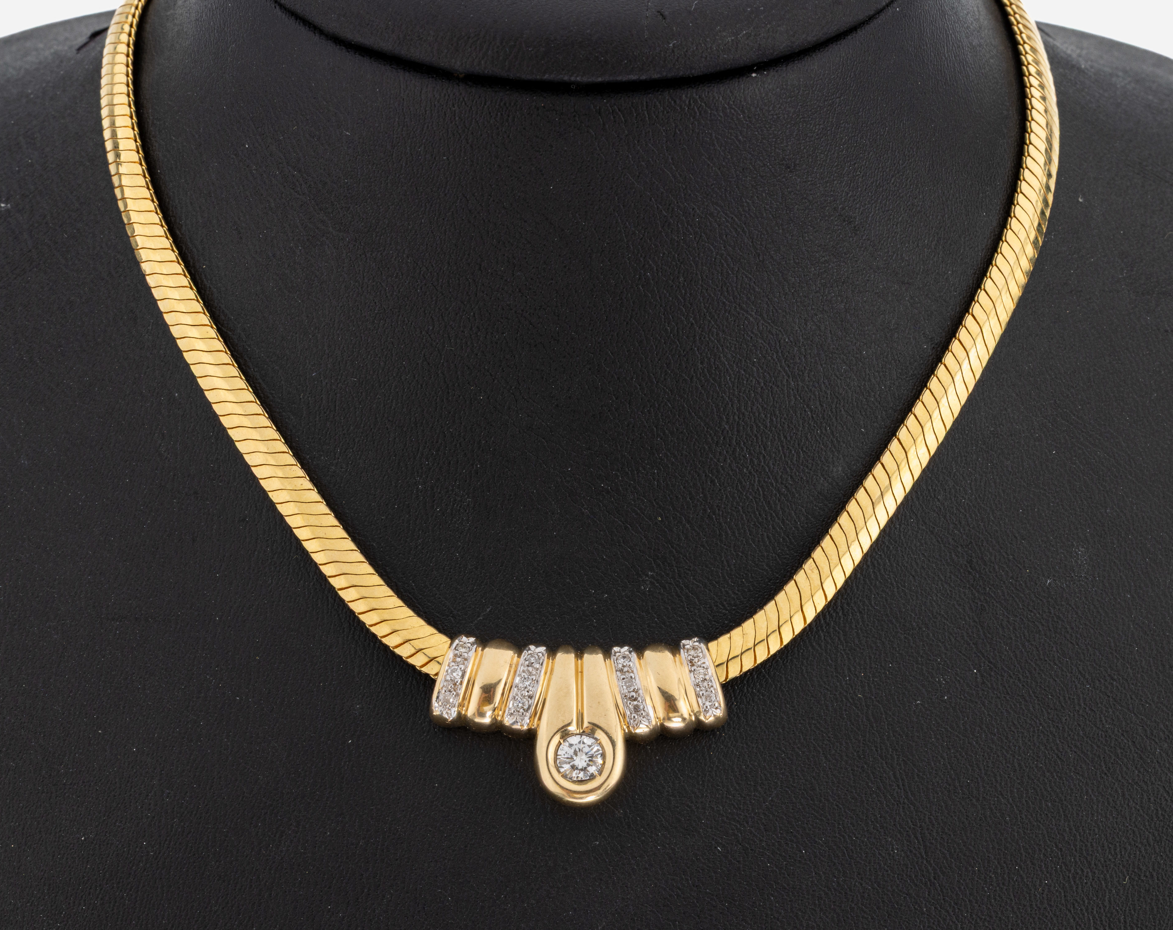 ct Weiß/p, 12 weitere Brillanten zus. ca. 0.15 ctWeiß/p, an Kette, GG 585/000,