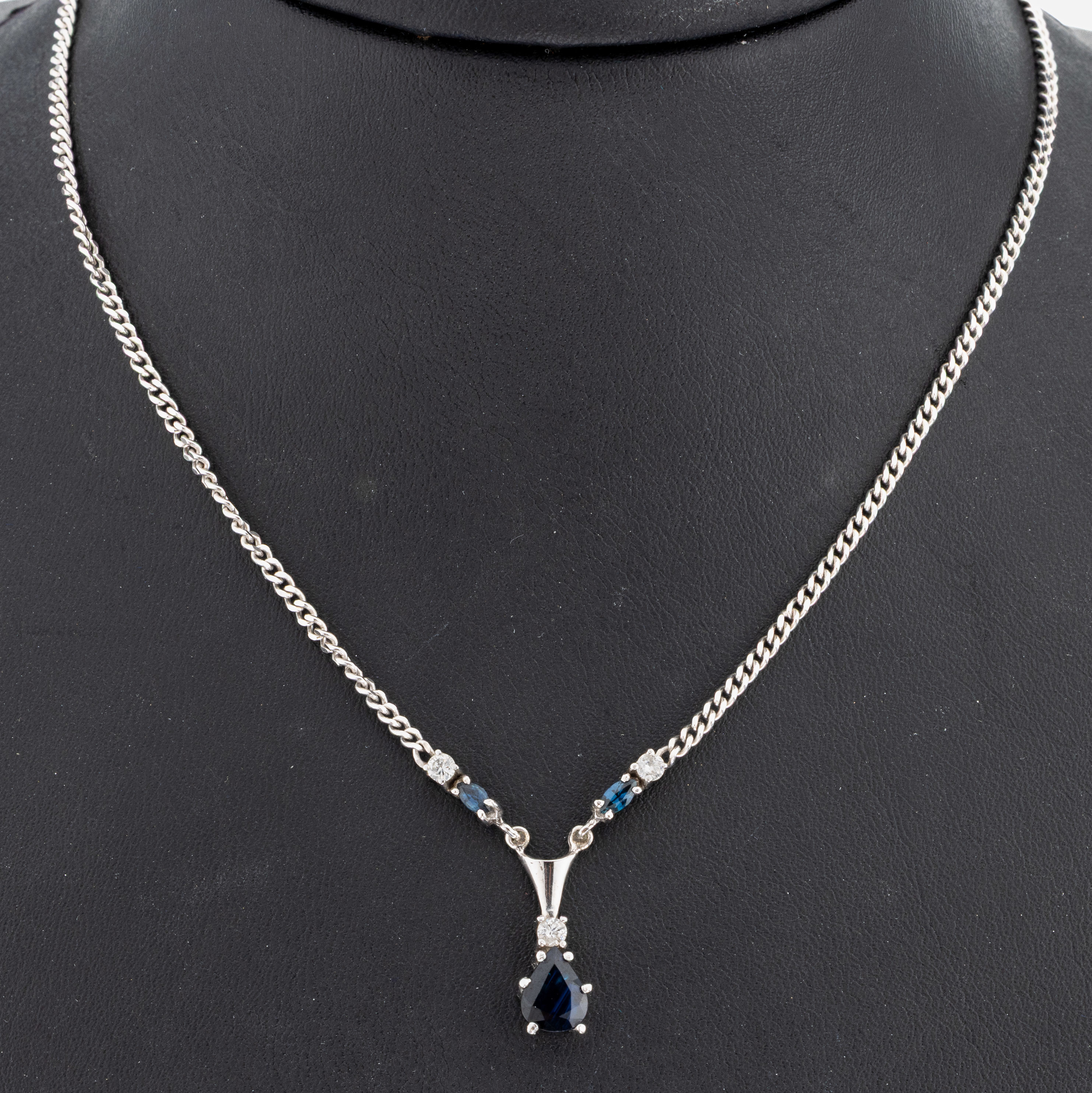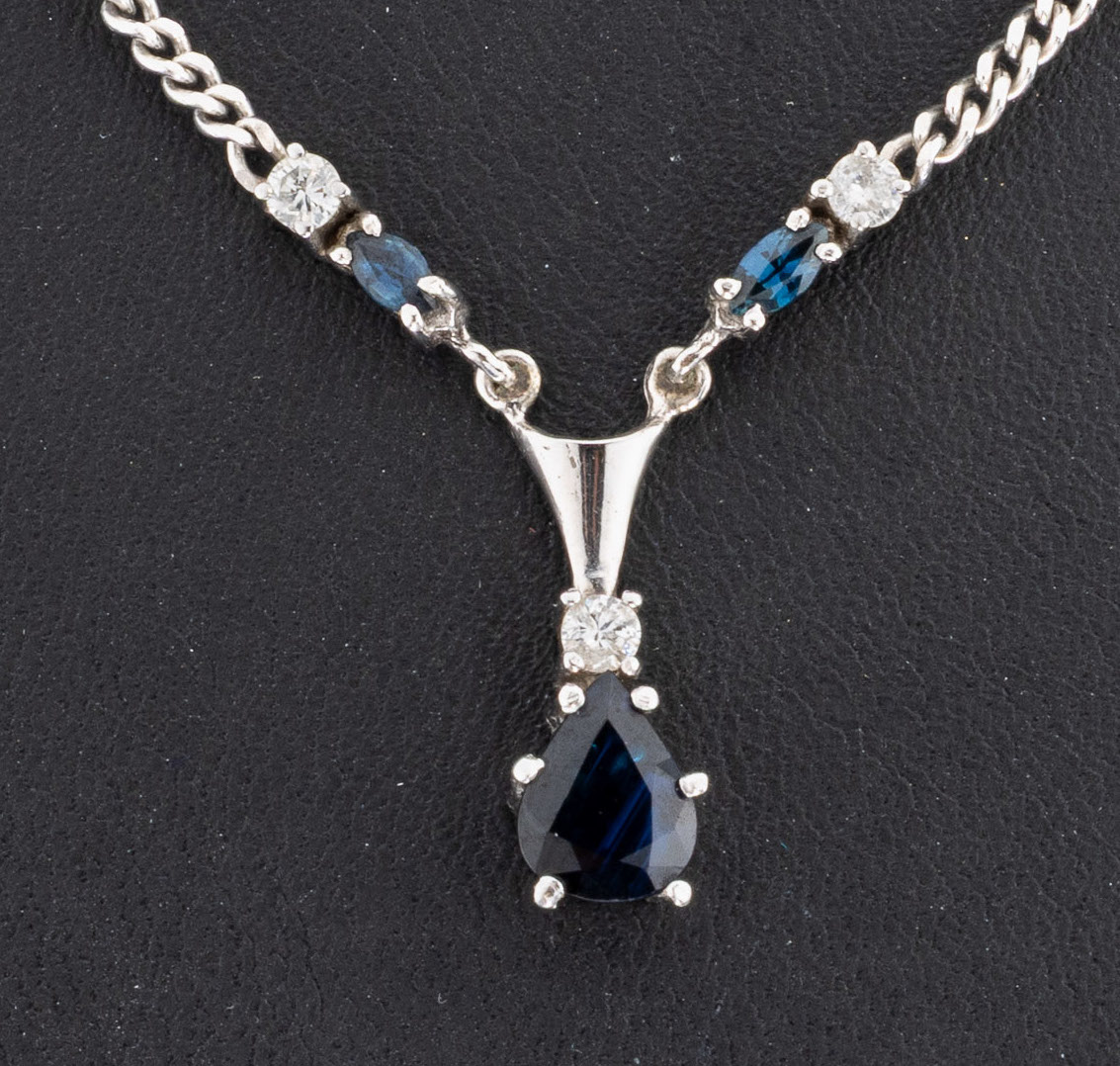 14 kt Gold Saphir-Brillant-Collier, WG 585/000, 1 facett. Saphir-Tropfen und 2 Saphir-Navettes