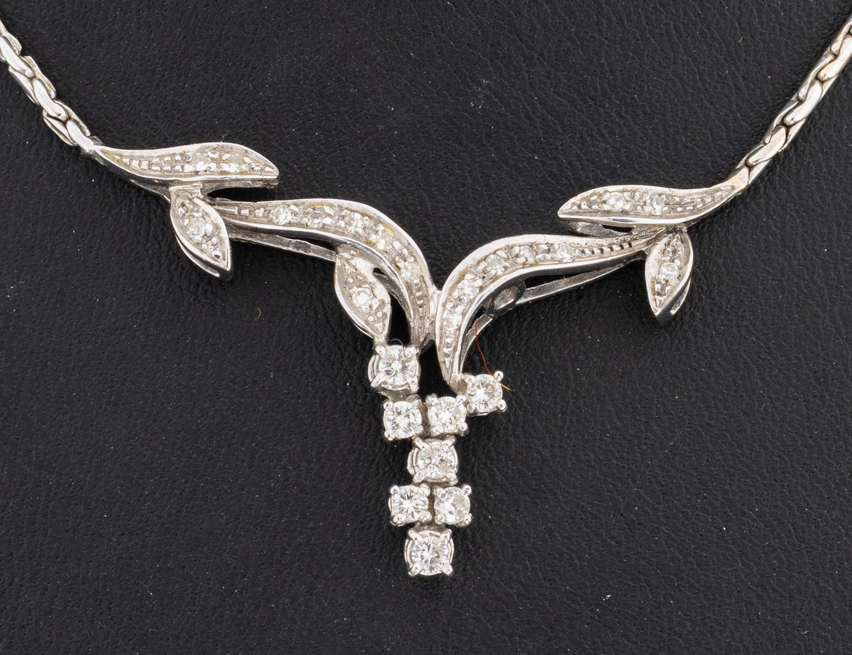 14 kt Gold Diamant-Collier, WG 585/000, geschwungenes Mittelteil, 8 Brillanten und