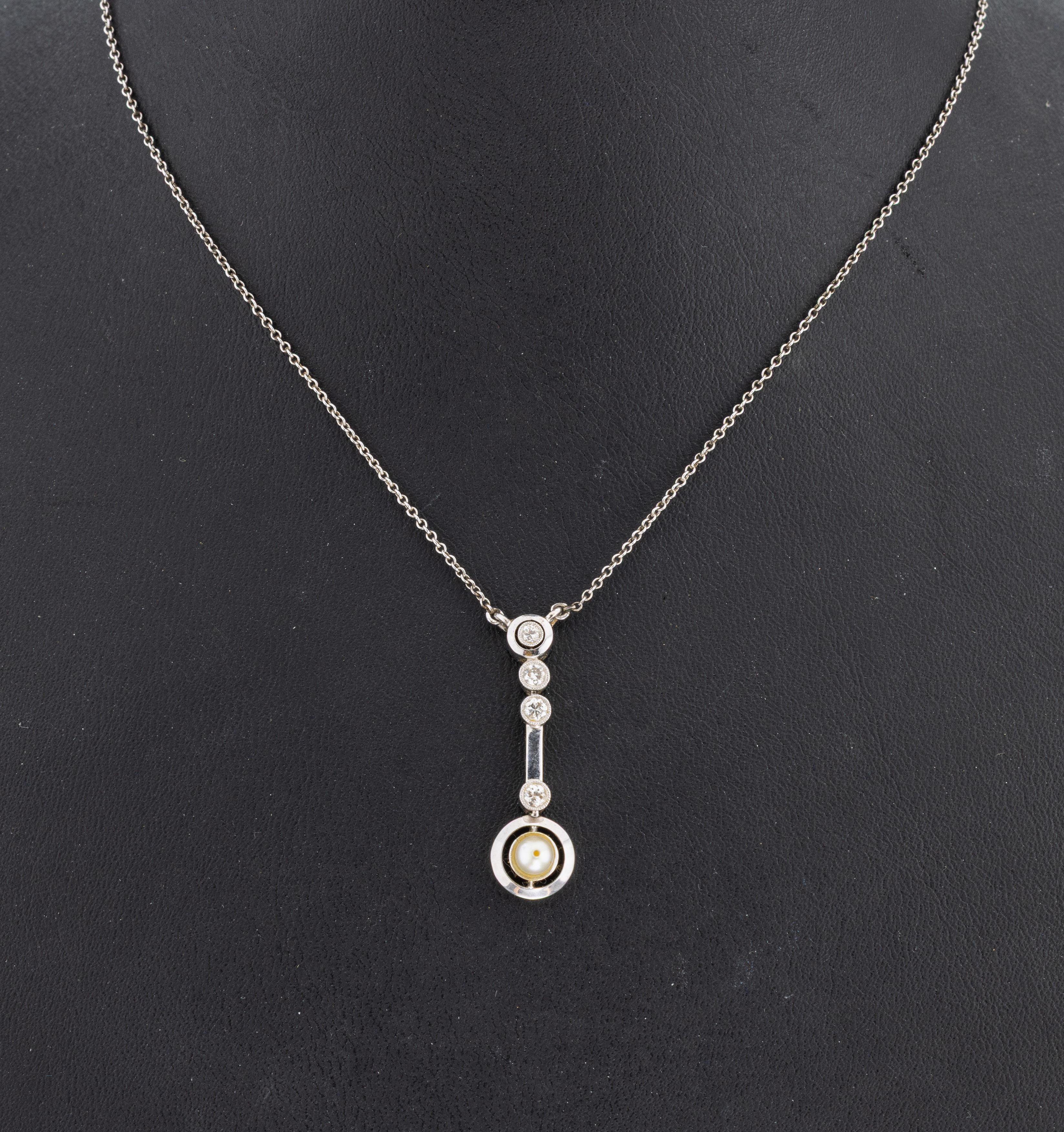 18 kt Gold Brillant-Perl-Collier, um 1920, Mittelteil WG 750/000, 4 Brillanten zus.