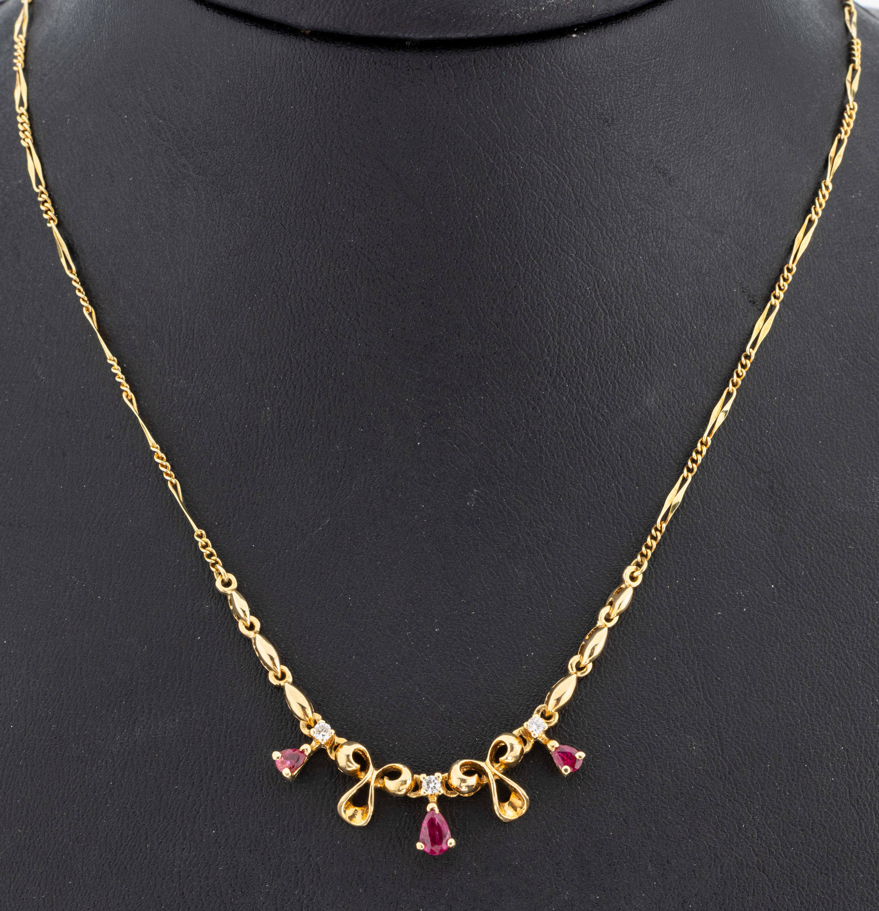 14 kt Gold Rubin-Brillant-Collier, GG 585/000, Mittelteil aus geschwungenen Elementen,