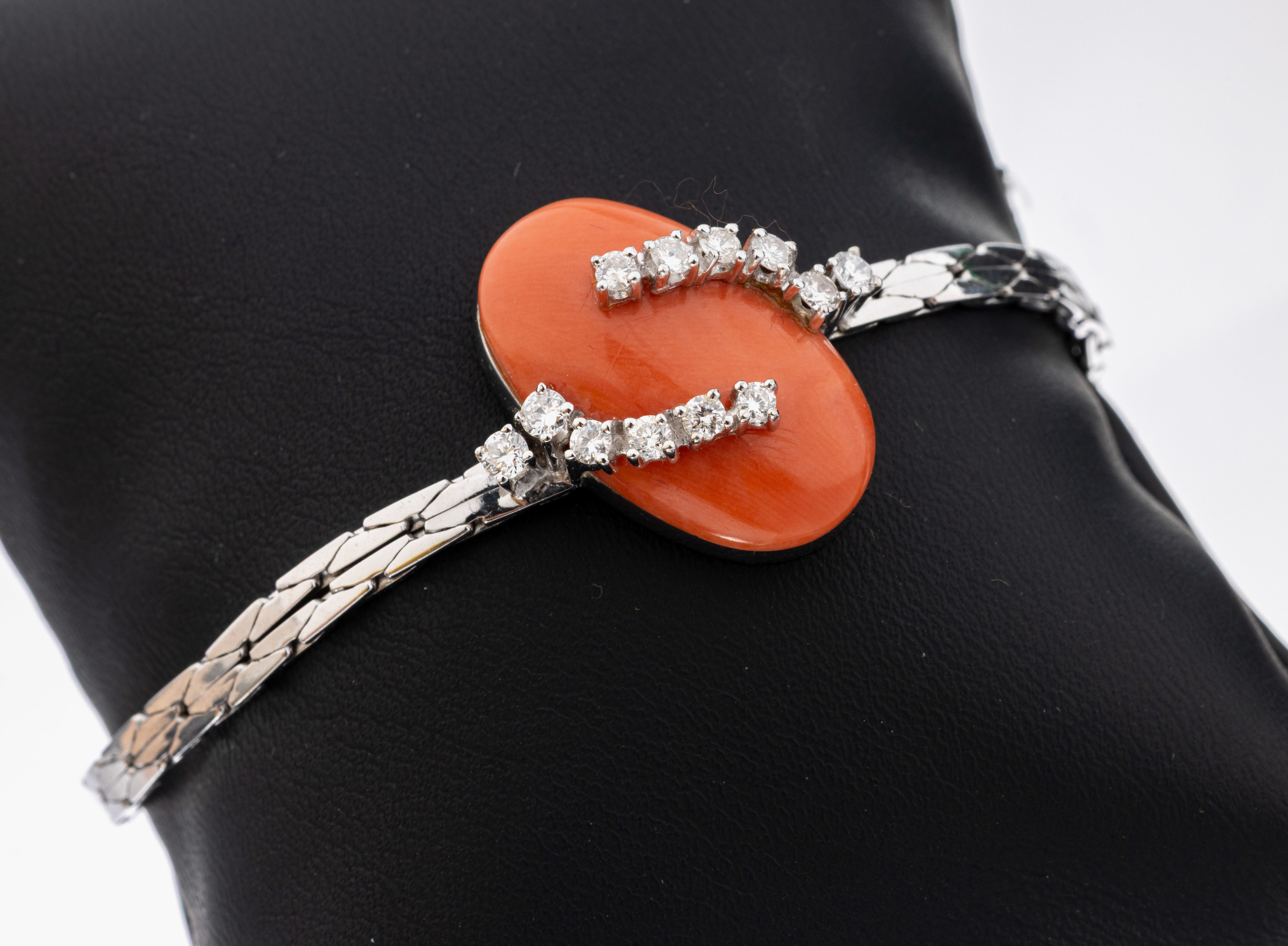 14 kt Gold Korallen-Brillant-Armband, WG 585/000, ovaler Korallen-Cabochon, 12 Brillanten