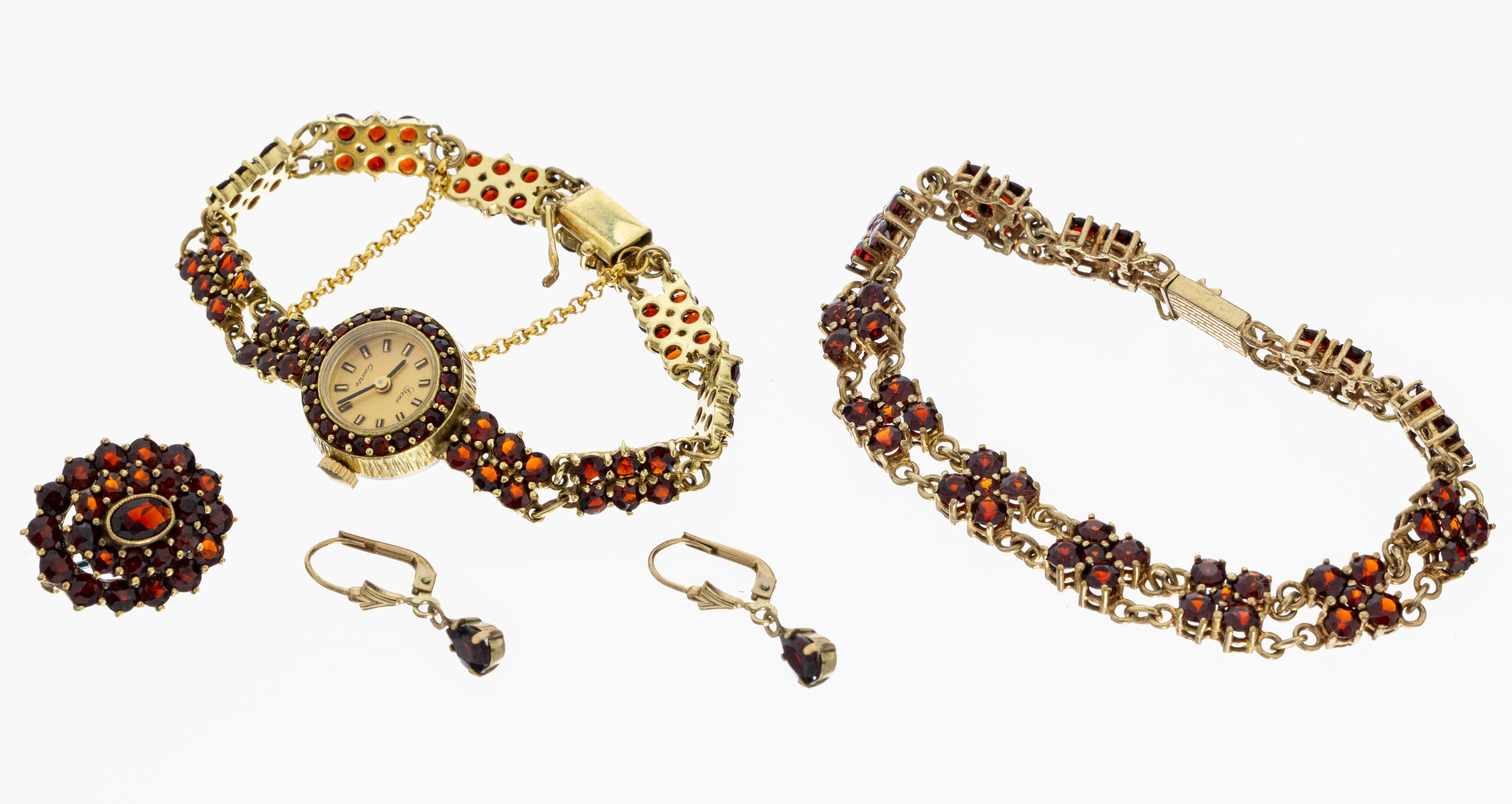 Konvolut Granat-Schmuck, best. aus: 1 Damenschmuckuhr, Metall verg., Quartzwerk,