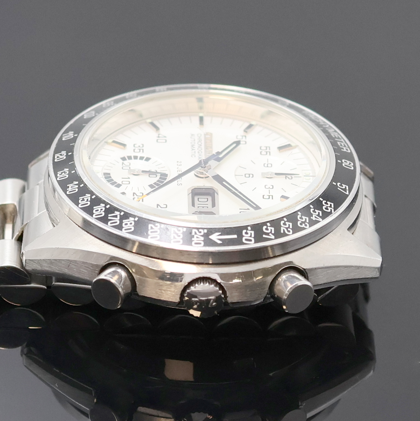 Automatik, Boden verschr., neutr. Stahlband m. Faltschl., Lünette m. Tachymeterskala,