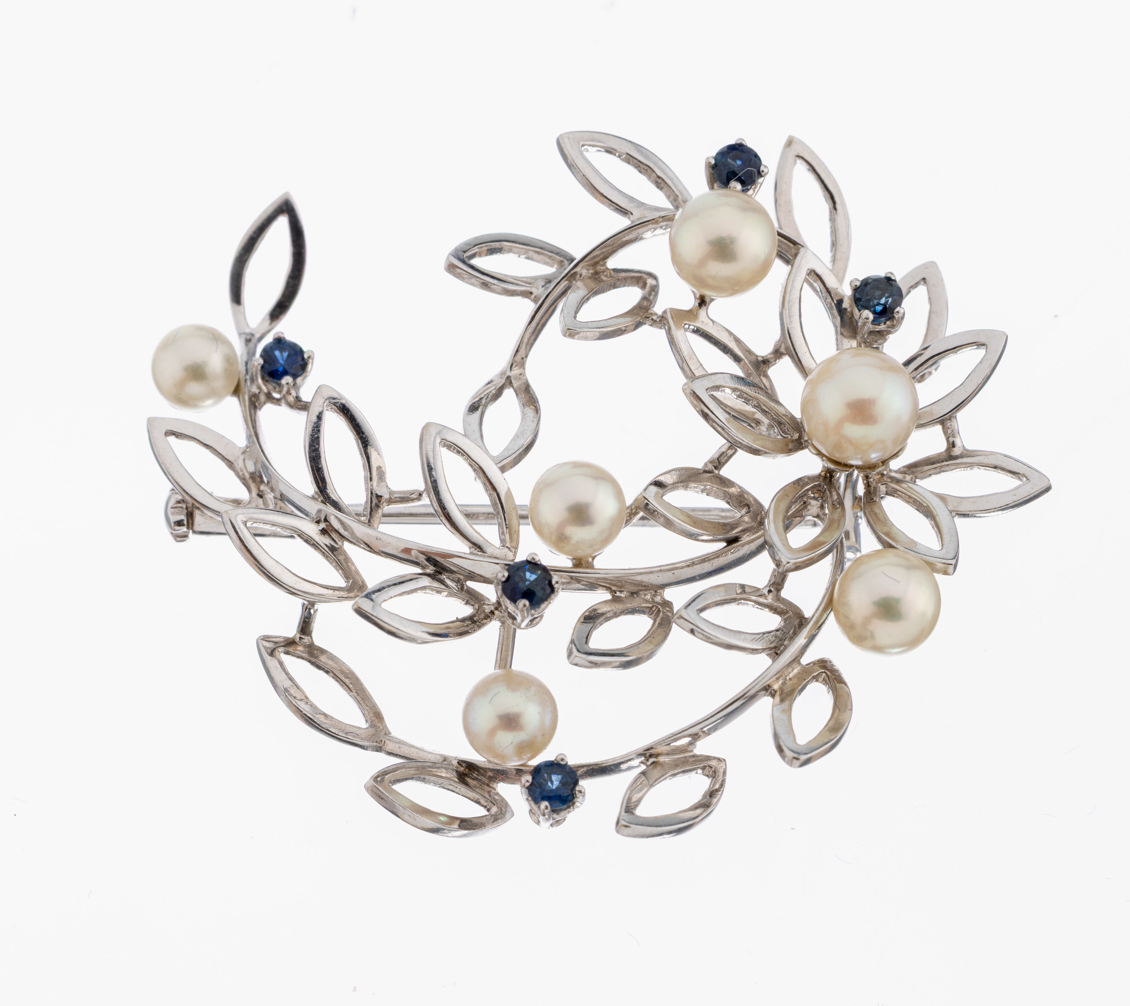 18 kt Gold Saphir-Perl-Brosche, 1960er Jahre, WG 750/000, geschwungen floral, 5 kl.