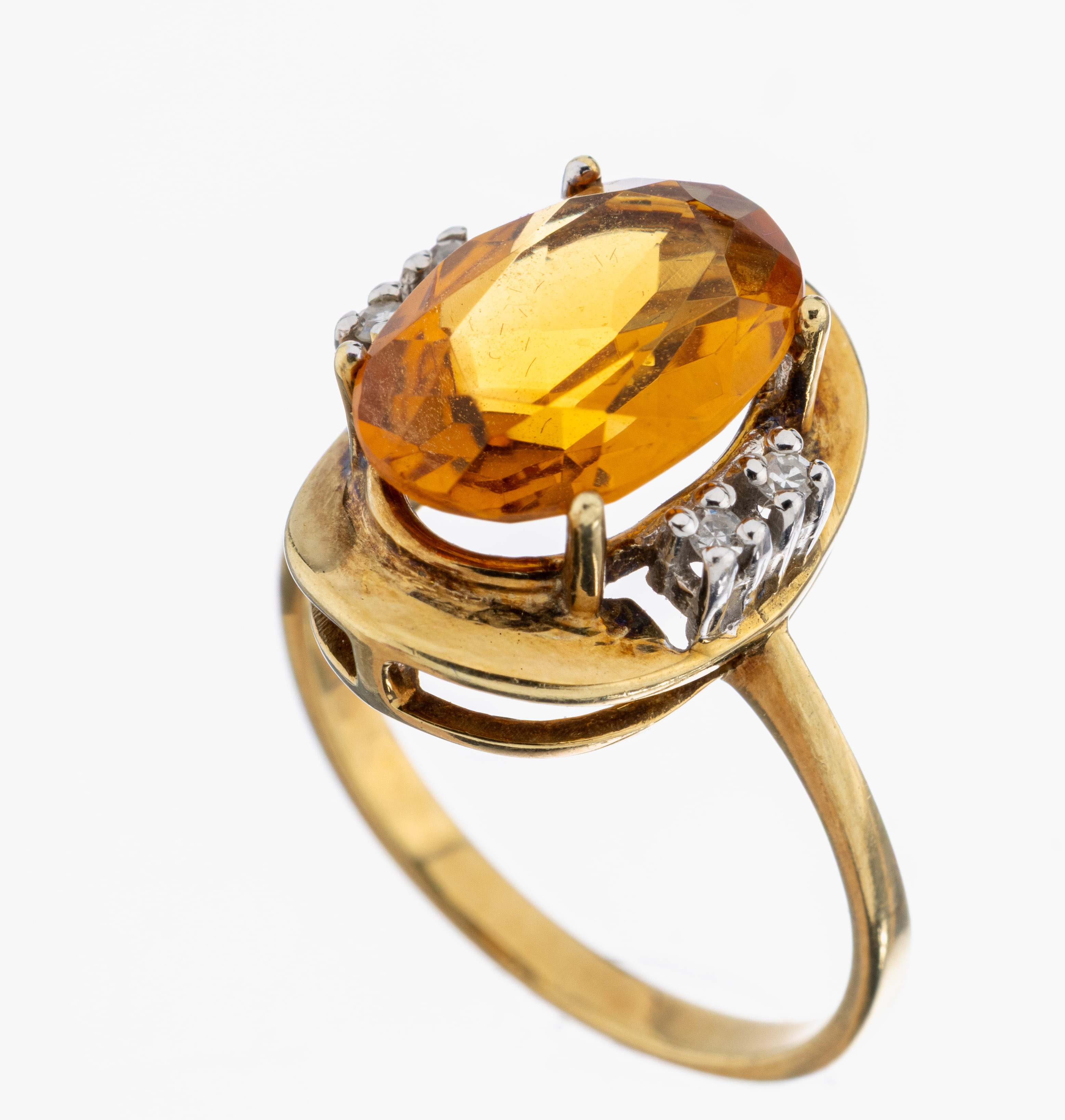 14 kt Gold Citrin-Diamant-Ring, GG/WG 585/000, ovalfacett. Citrin ca. 3.80 ct, 4