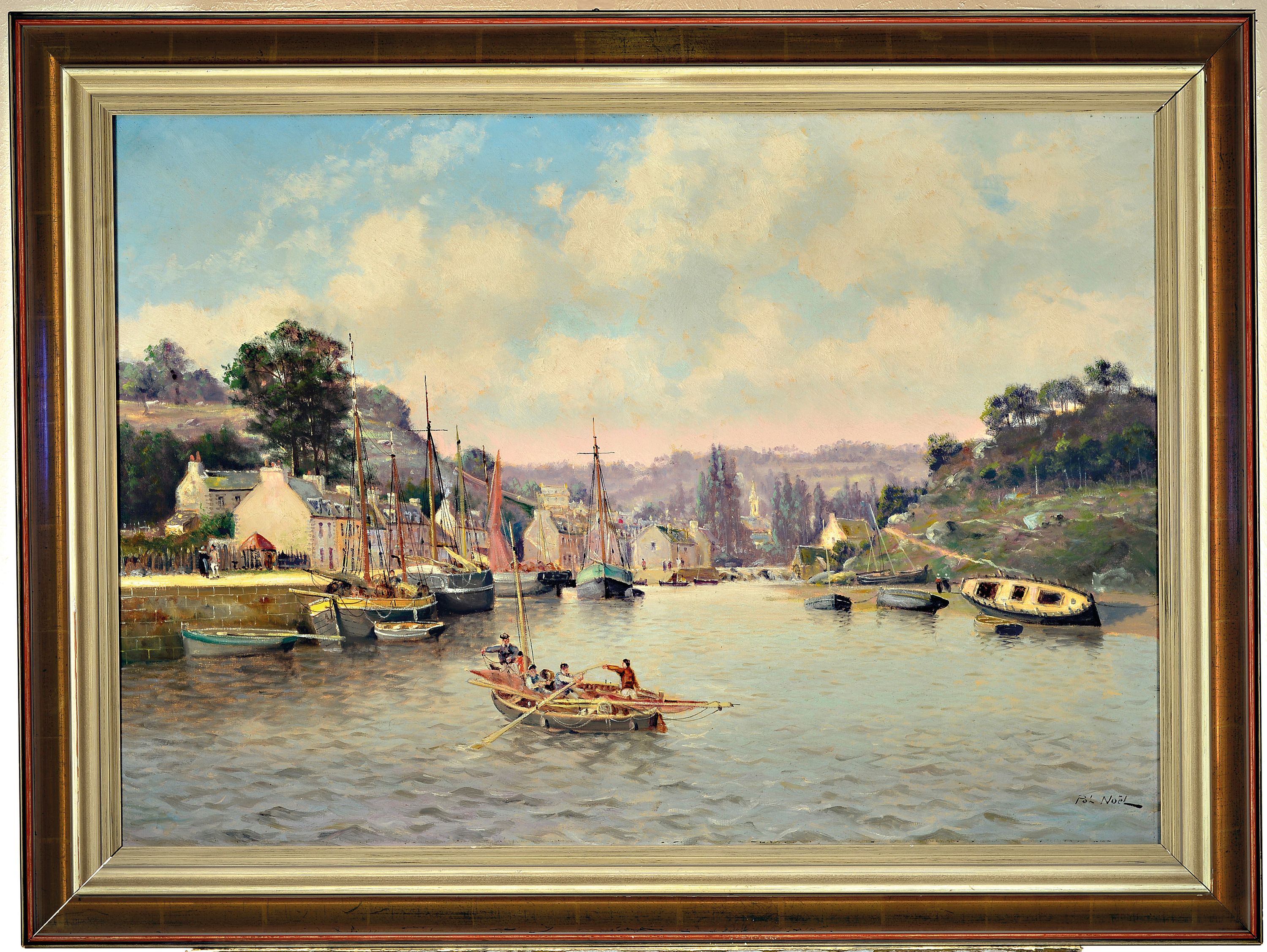 Pol Noel, geb. 1850, französisch, Fischerdorf in der Bretagne, Blick in den Hafen,