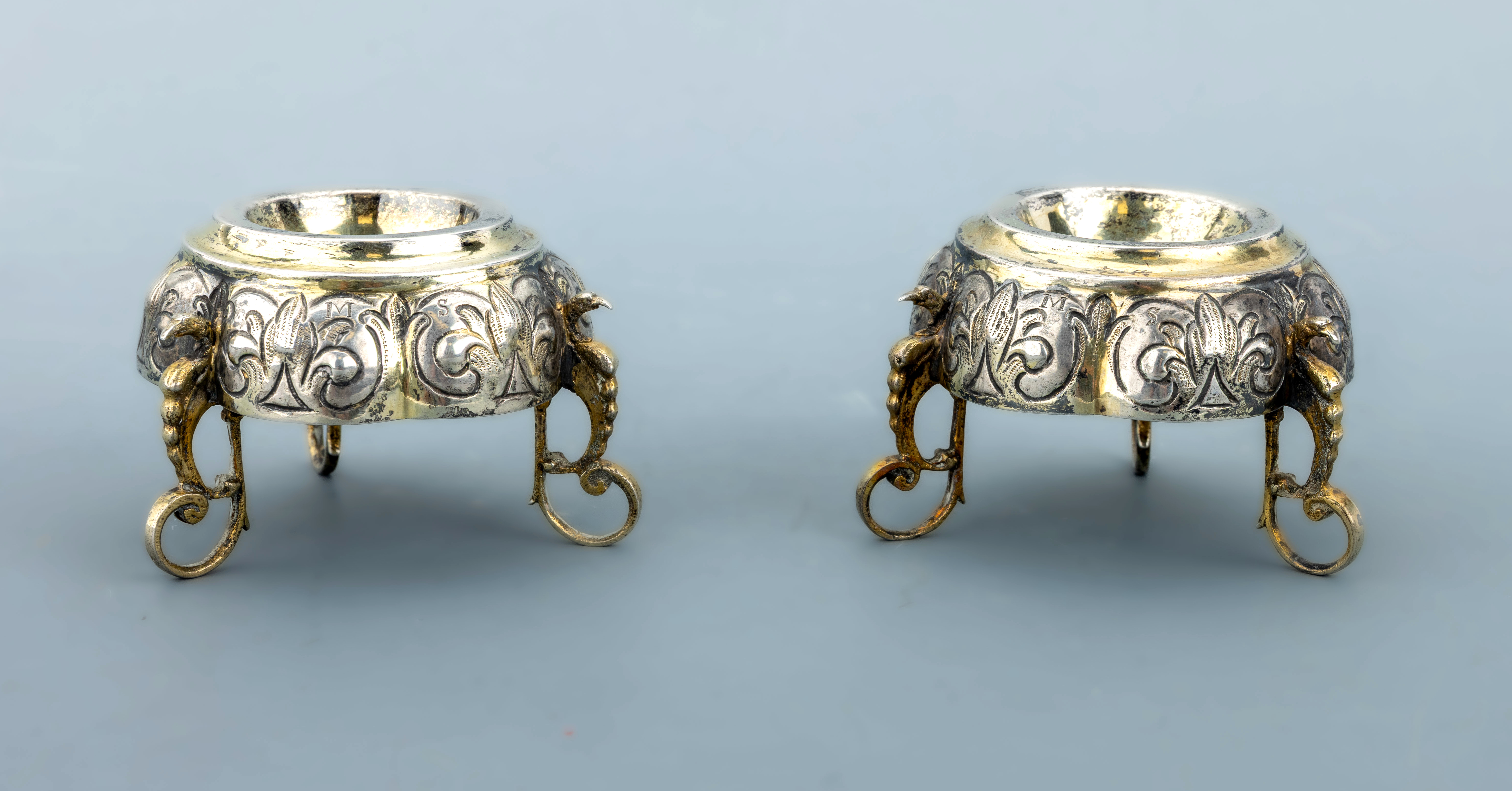 Set 2 Salznäpfe, Augsburg um 1680-1720, Silber teilverg., 6-passig gewölbte Wandung,