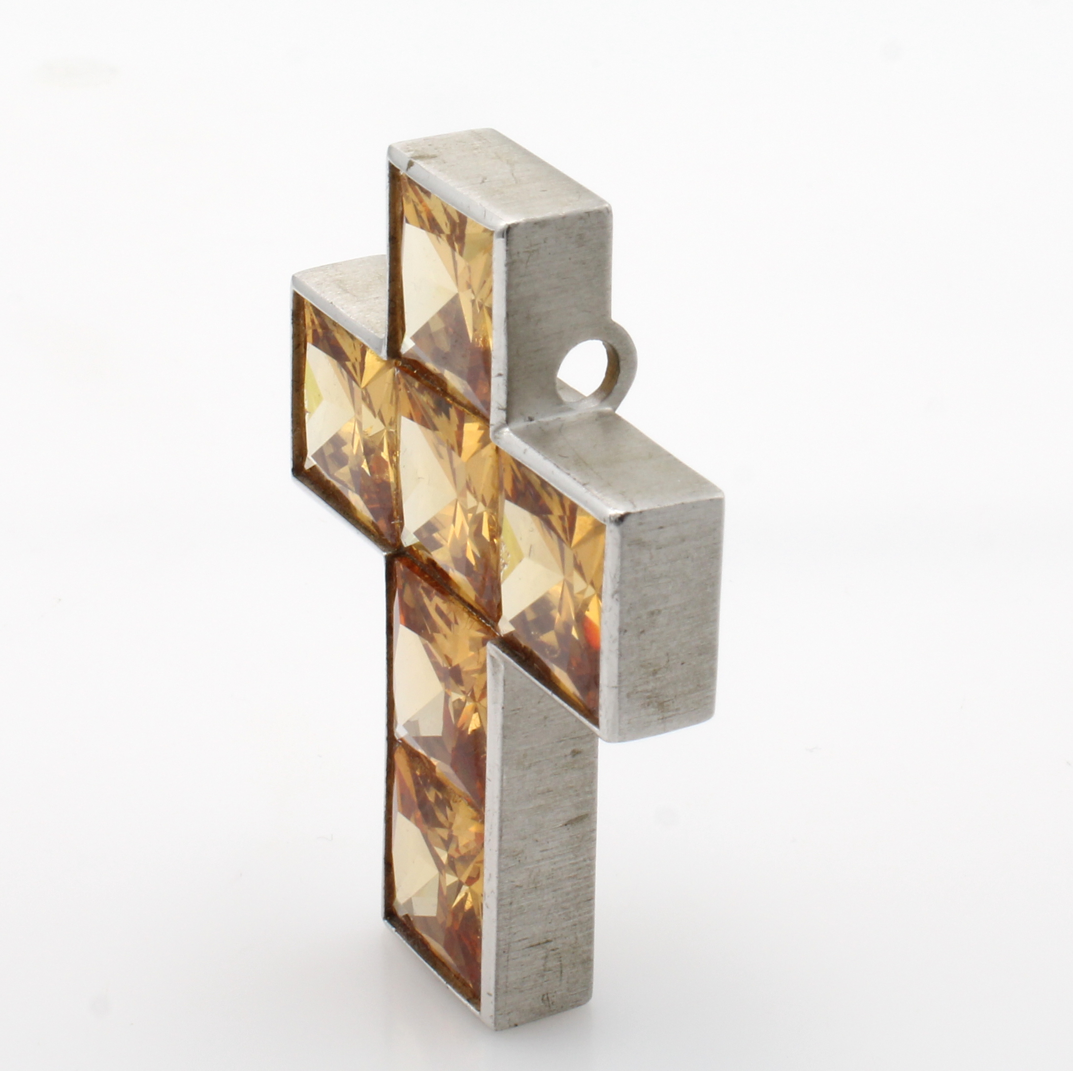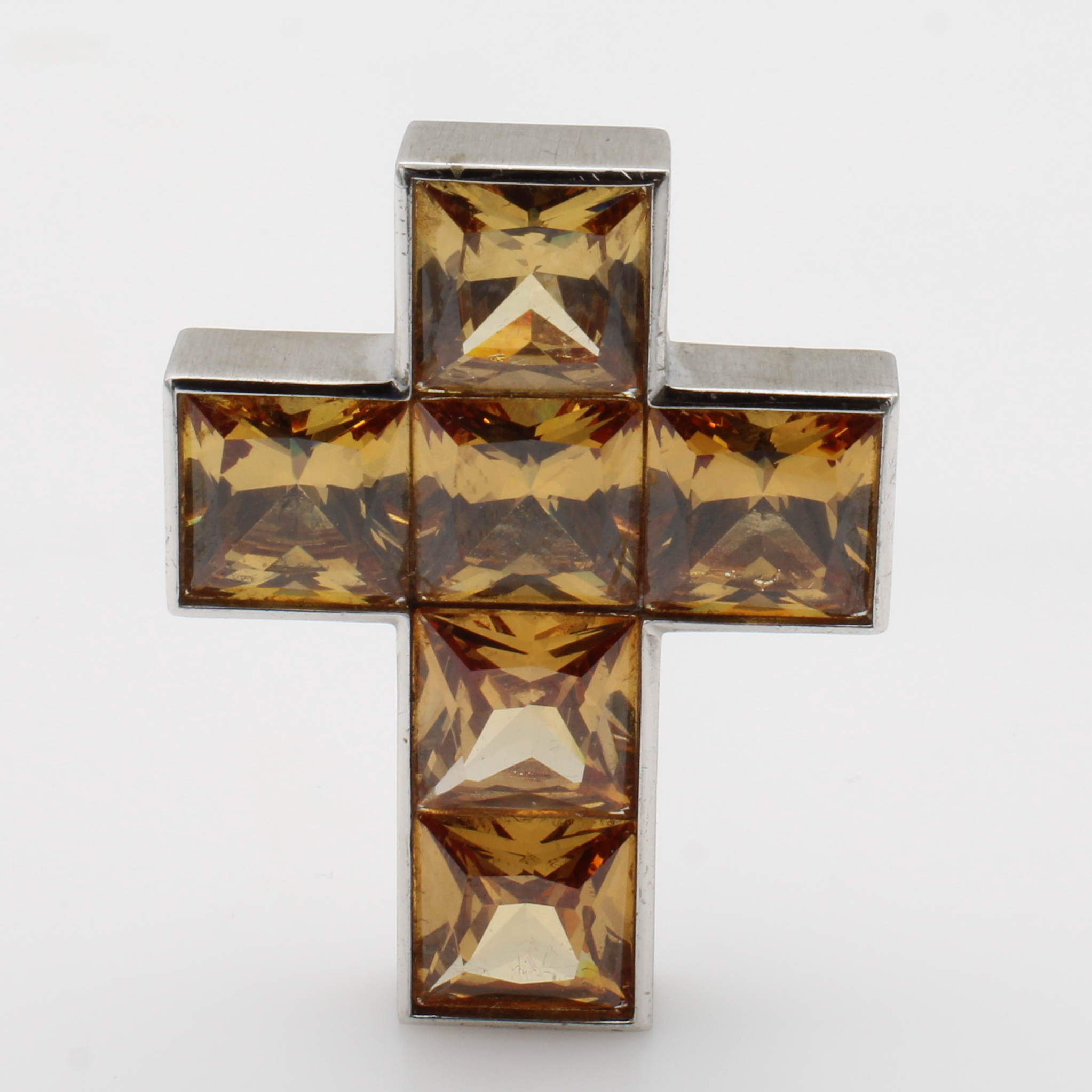 BUNZ Kreuzanhänger mit Synthesen, 925er Silber, Oberfläche fein gebürstet, 6 facett. citrinf. Synthesen im Scherenschliff, ca. 5.5 x 4 cm, ca. 41 g