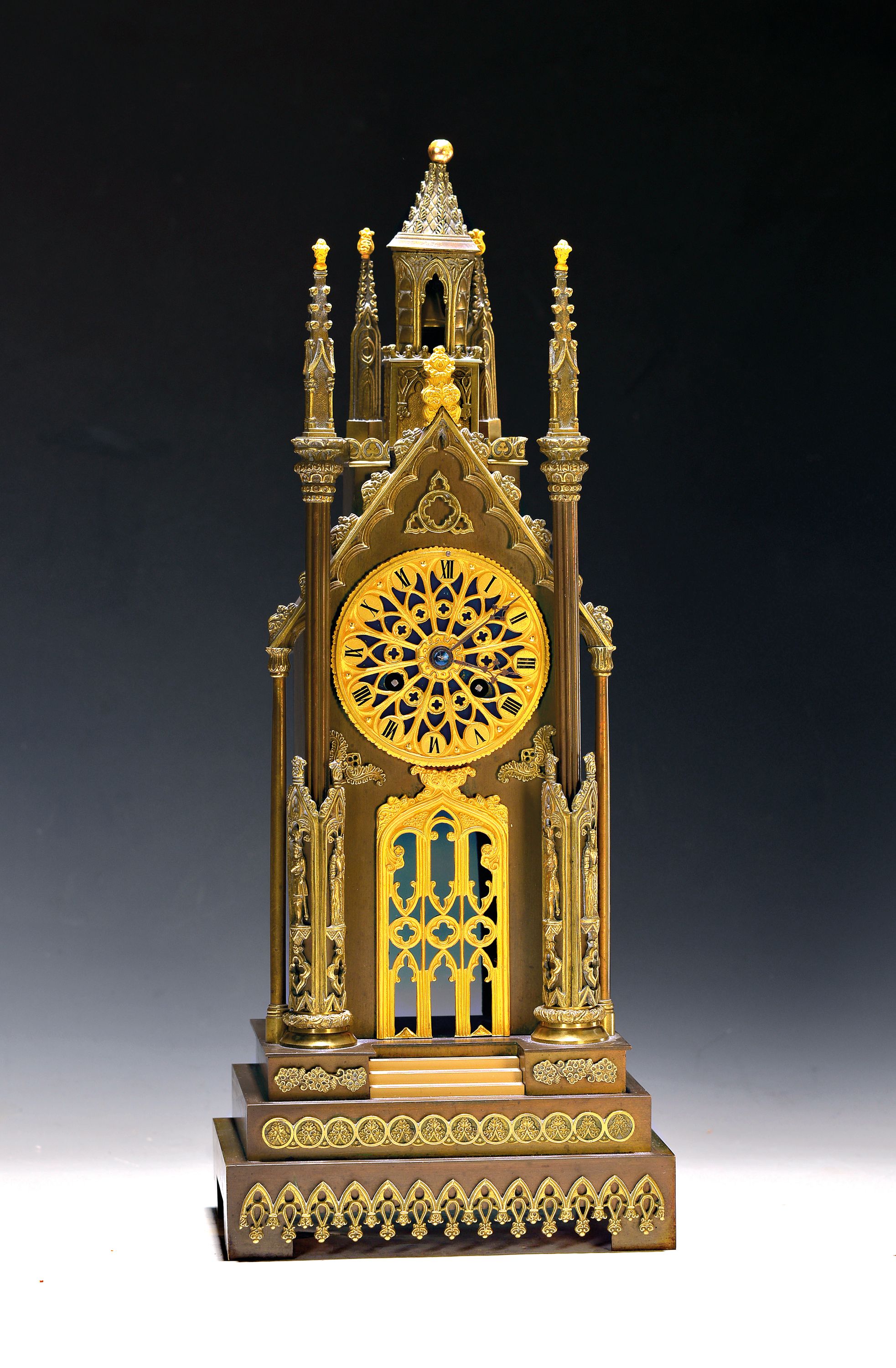 Türmchenuhr, Frankreich um 1900, in sog. Kathedralform, Bronzeguß vergoldet und