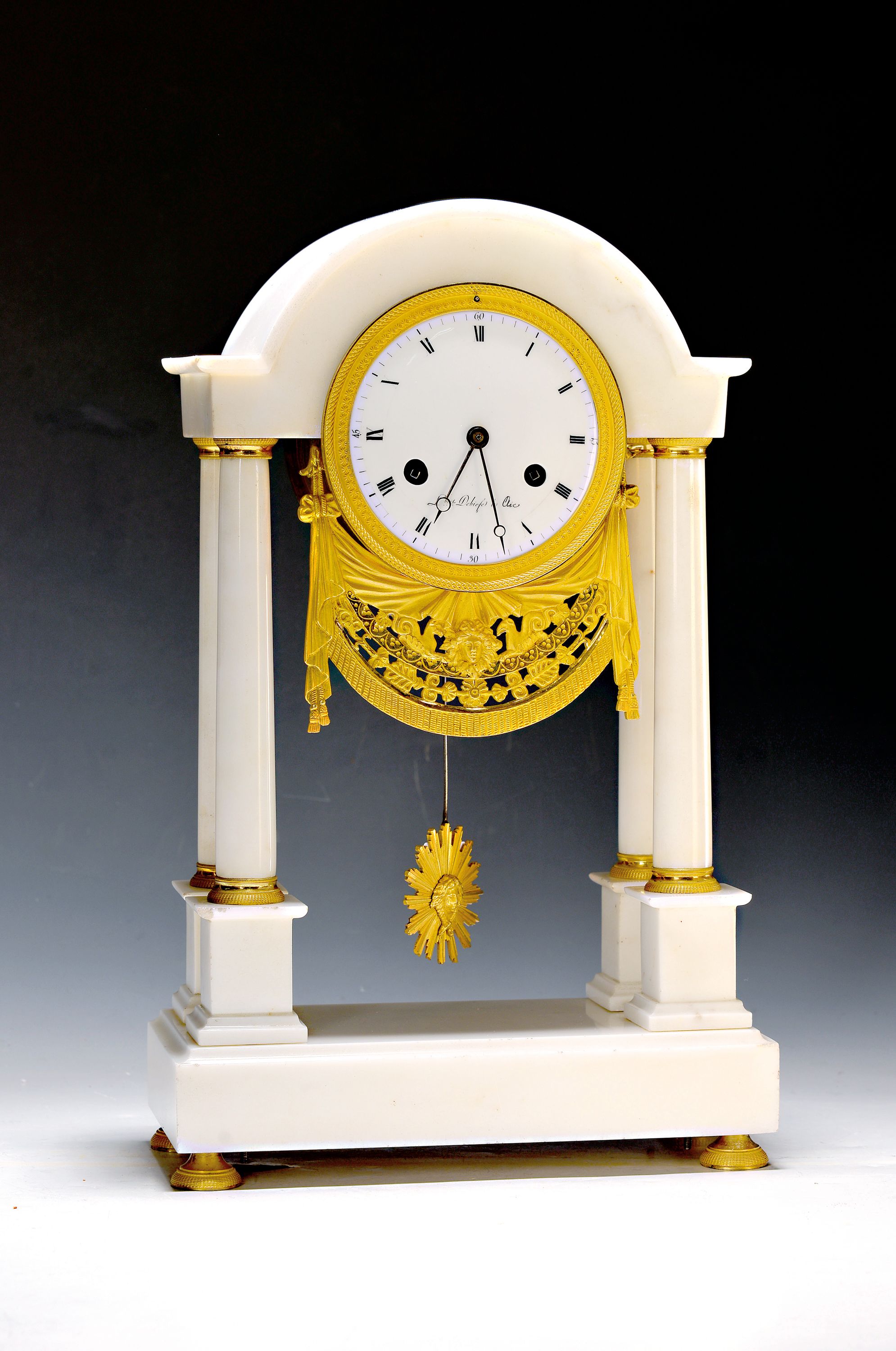 Portaluhr, Frankreich um 1800, weisser Marmor, vergoldete Basen und Kapitelle, Plinthen